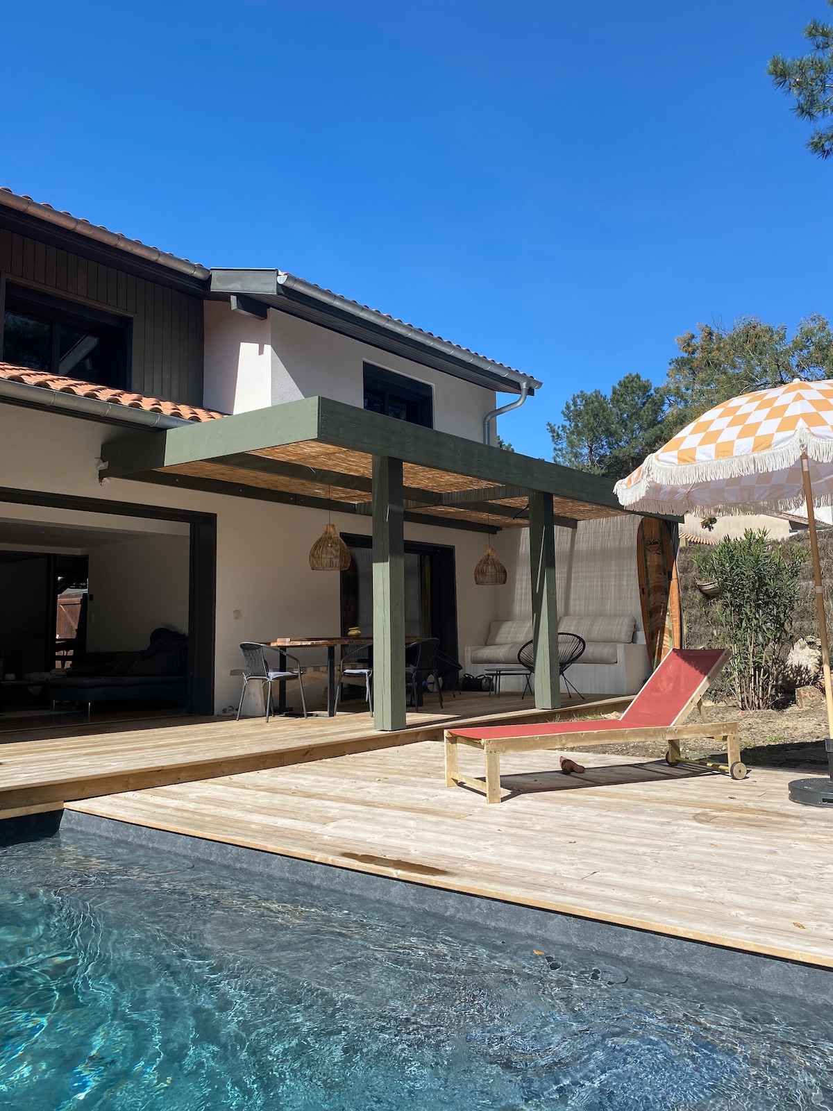 🐚 Dobro došli u vilu Sel & Sable — Bohčme Spirit, 5 minuta hoda od okeana 🌿 Smještena između dina i borova, naša vila je na nekoliko minuta hoda od plaže Les Bourdaines. Uživajte u malom bazenu za opuštanje, terasi sa plančom, klima-uređaju i besplatnom parkingu. Svetla čaura između okeana i šume, boemski duh i prirodni materijali, idealno za porodični odmor gde se vreme usporava i leto traje malo duže. Posteljina i peškiri za kupanje su obezbijeđeni.