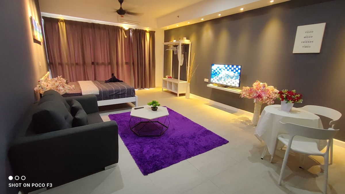 Istražite naš udobni studio apartman koji može da primi 2 do 3 osobe sa bračnim krevetom i sofom na razvlačenje. Samo 15 minuta vožnje od KLIA T1/T2, mjesto je okruženo mnogim restoranima, ograncima brze hrane, namirnicama i prodavnicama veša, a sve je u neposrednoj blizini. Uživajte u svim sadržajima, uključujući dječje igralište, prostor za roštilj, teretanu i bazen, uz non-stop bezbjednost. * Nije dostupno, ostavite prtljag prije vremena prijave. Zbog dizajnirane zgrade, morate da pređete 10 stepenica da biste došli do lifta.
