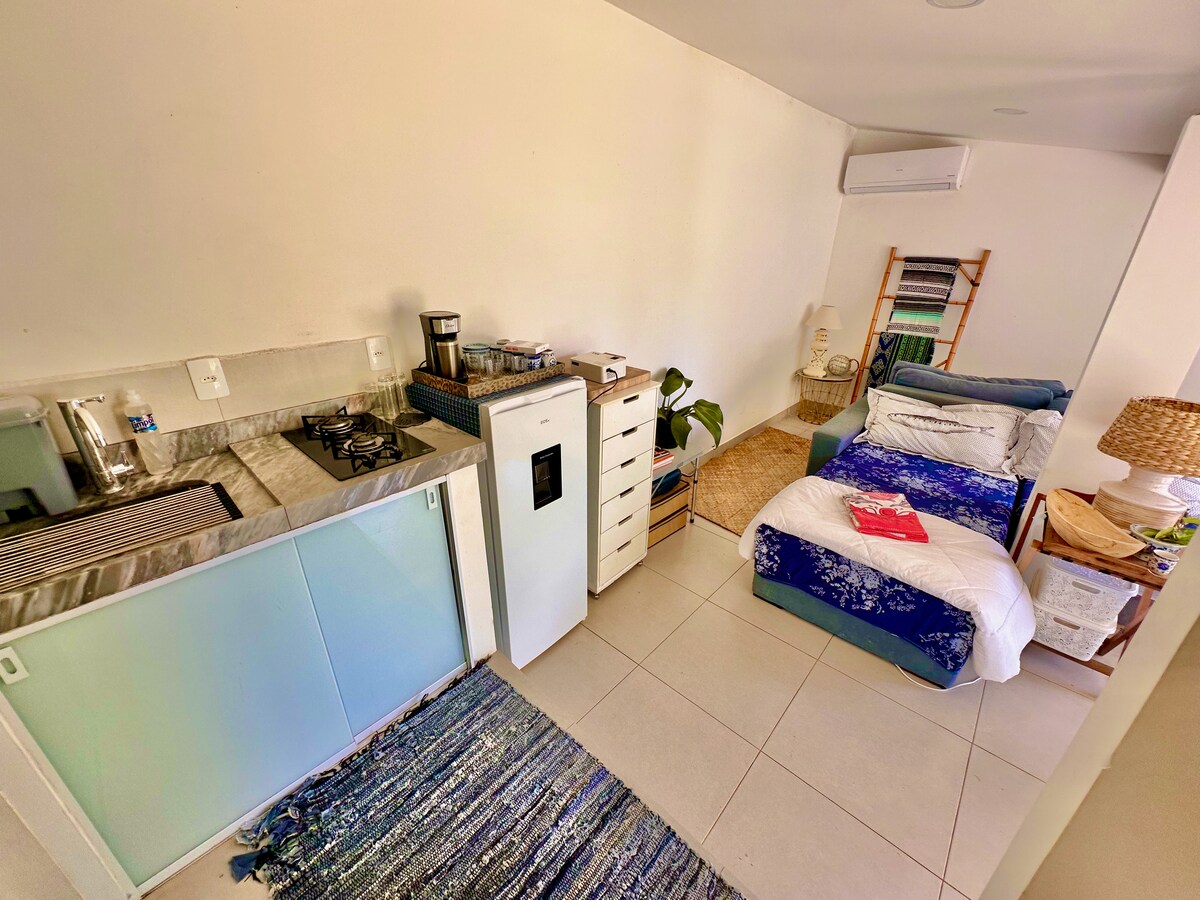 Beach Studio Suite: Modern Comfort Steps from the Ocean Feel the Manguinhos breeze in this exclusive retreat located just a 3-minute stroll from the beach. Situated on the ground floor for easy access, it features a Queen bed, a fully equipped kitchen, and a private cinema experience with a projector. Enjoy a breakfast basket served in your suite and express check-in. The ideal sanctuary for couples seeking convenience and the best location in town. Book your beachside getaway.