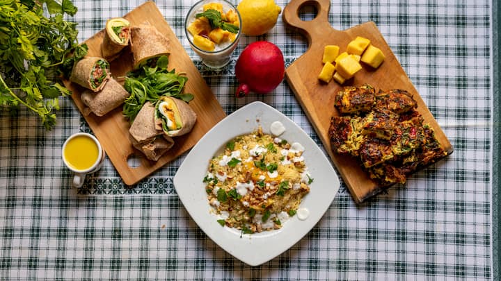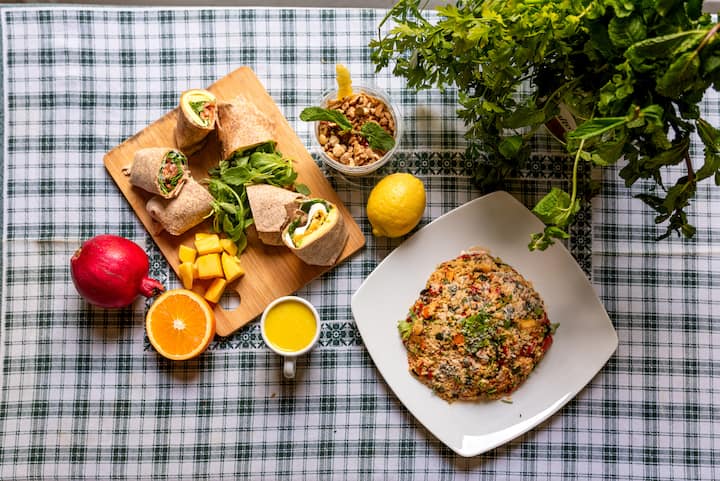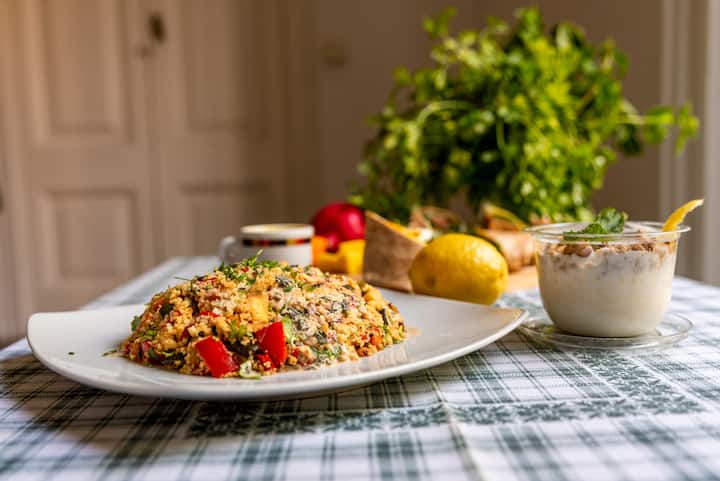 Uključuje obloge od pita, salatu od kuskusa, voćne ražnjiće i vodu ili organski čaj.