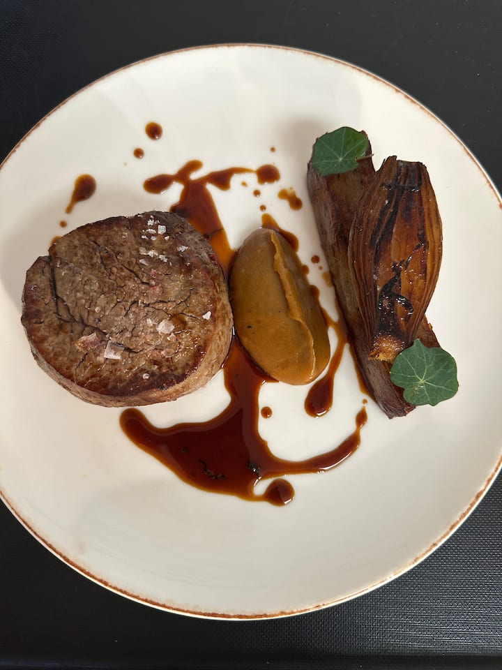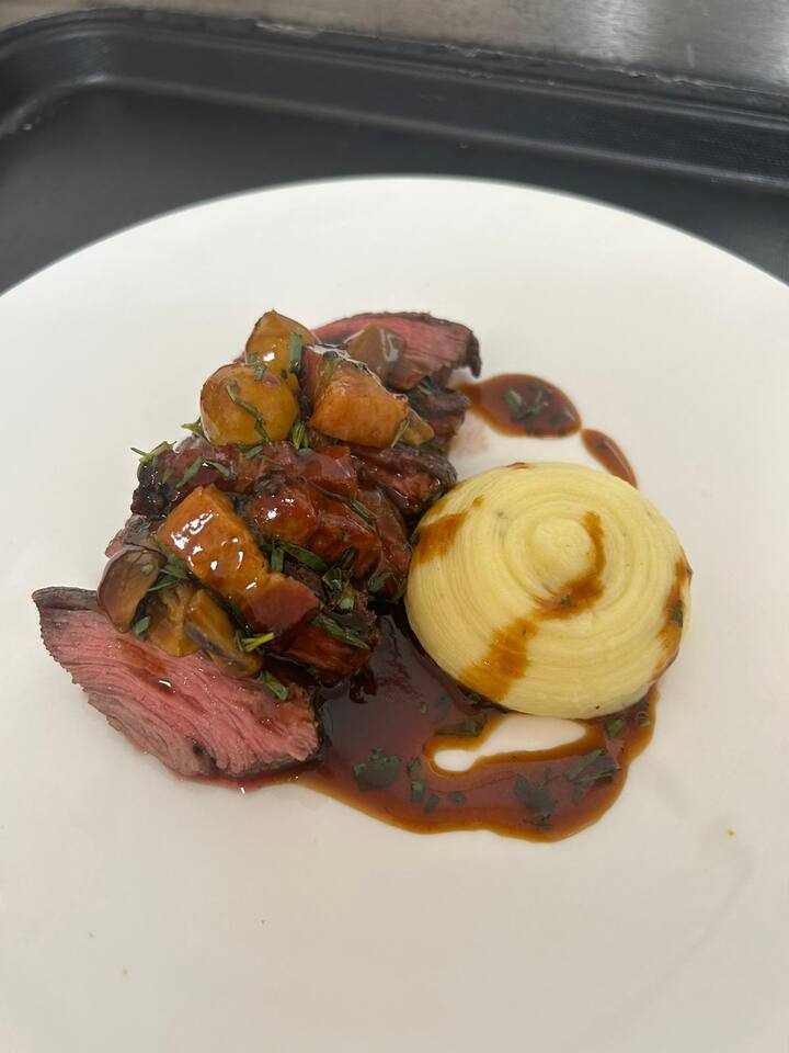 Glavno jelo – – [ ] odrezak od buta od govedine odležan 28 dana, gratinirani krompir sa glazurom od šalota, pire od pečene paprike, hrskavi luk i sos od crnog vina