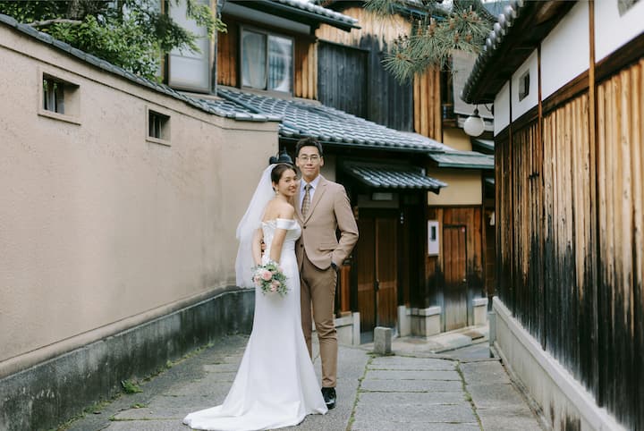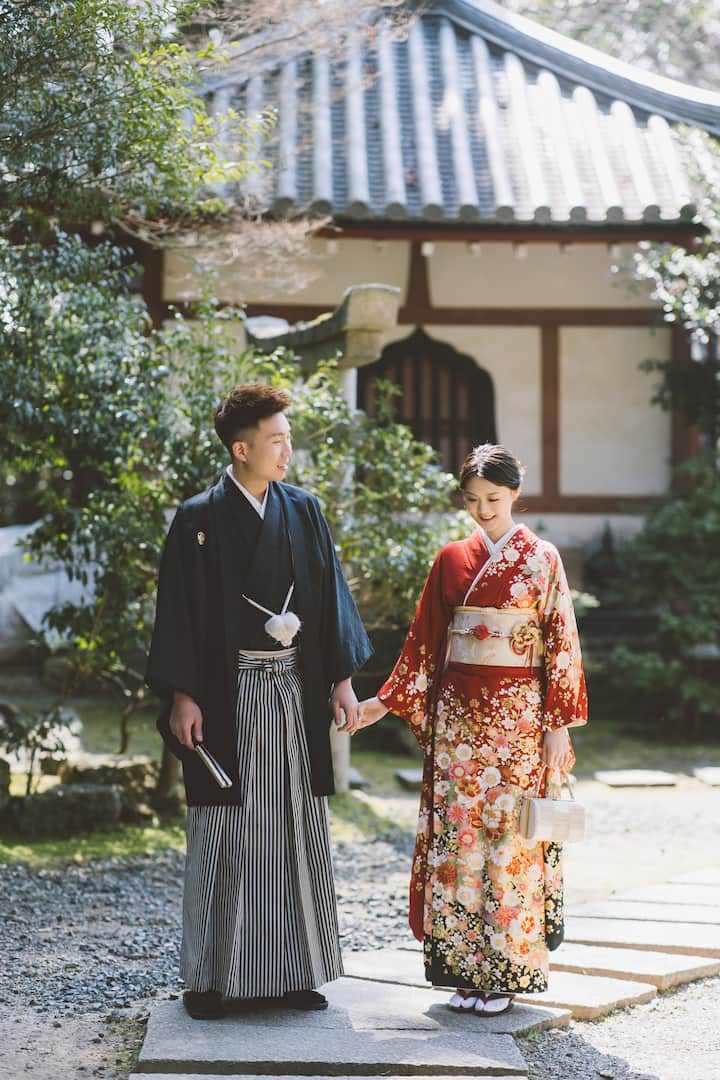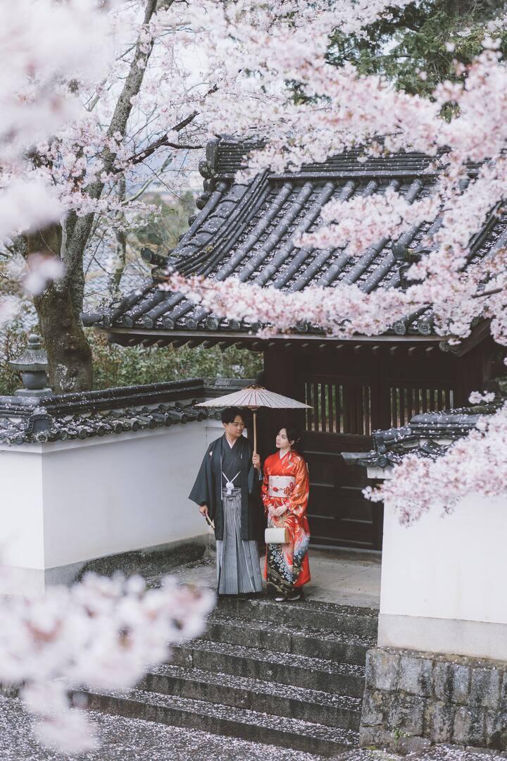 京都半日婚纱摄影体验,整体时间约5小时(含化妆与行程),实际拍摄约2–3小时。可穿婚纱、和服或便装;婚纱可提供,和服可协助预约。拍摄完成后提供约200–300张原图,其中包含24张精修照片。
