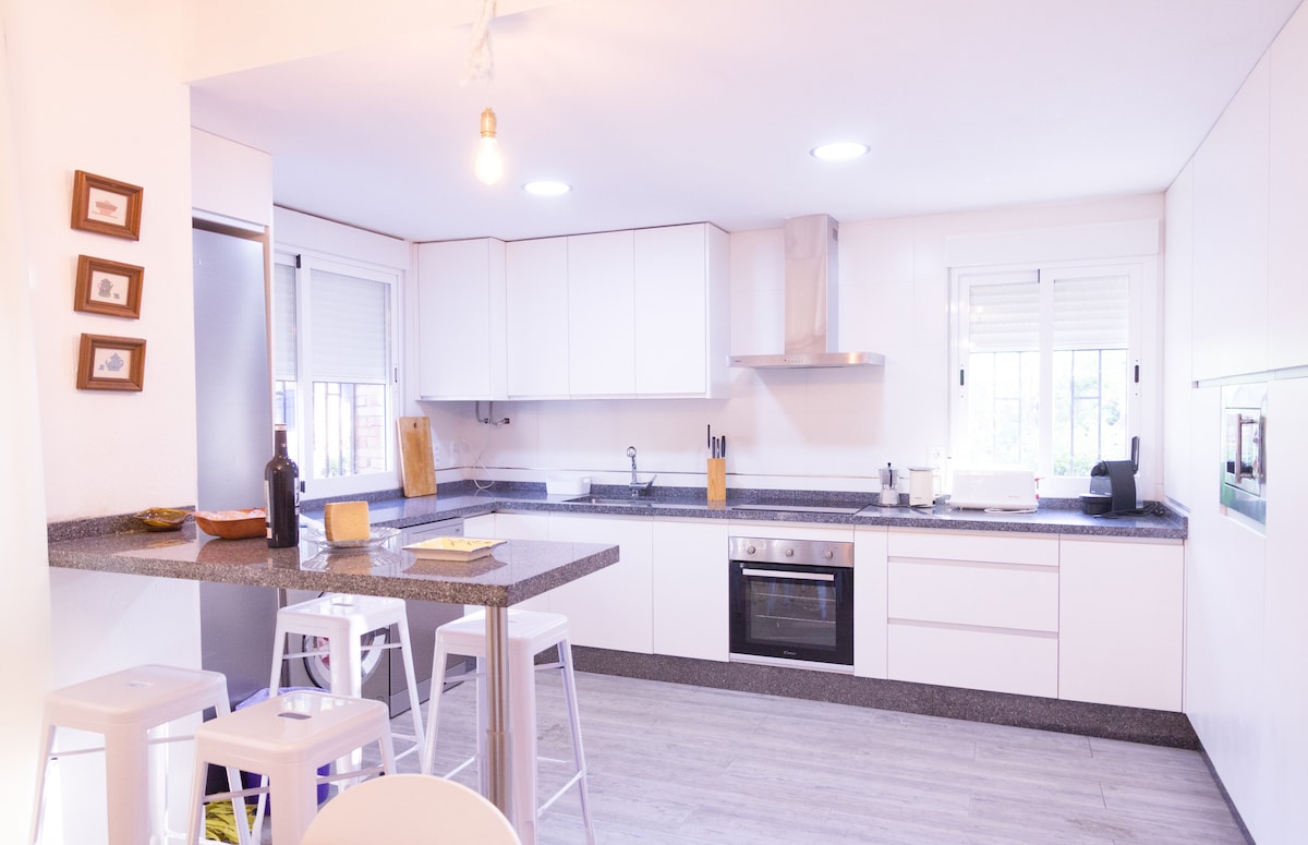 Uživajte u jedinstvenom odmoru u blizini Sevilje! 🏡 Ova divna vila može da primi do 8 osoba i ima četiri spavaće sobe: tri sa krevetima za jednu osobu i jednu sa bračnim krevetom, 3 kupatila, od kojih je jedno u glavnoj spavaćoj sobi. Potpuno opremljena kuhinja. Uz besplatan parking za tri automobila, nećete morati da brinete o prevozu. Za istraživanje grada, stanica metroa Evropa udaljena je samo 200 metara i za nekoliko minuta vas vodi do centra Sevilje. Čekamo vas!