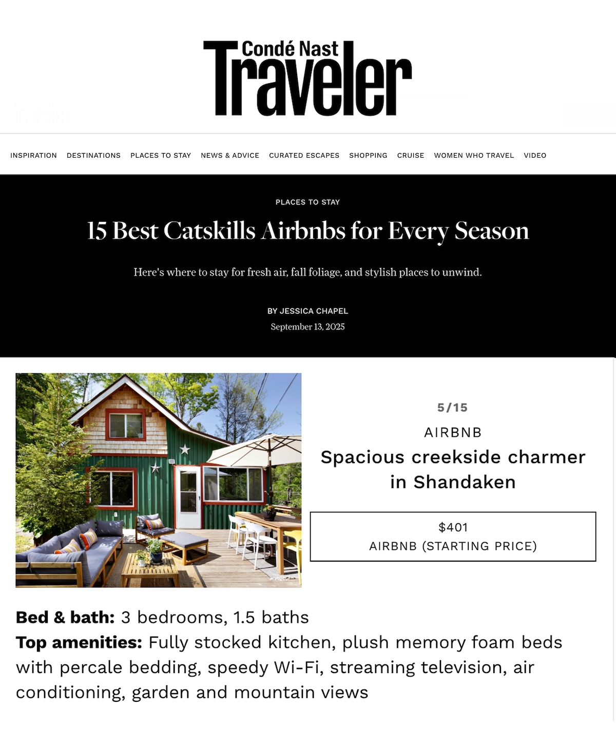 Beautifully furnished & charming with plenty of outdoor space to play around, have a fire, grill- and beautiful barn. A small stream runs on the edge of the property, perfect to sit beside, and a guest cottage with extra sleeping space (queen, trundle and aerobeds/ bathroom). It's full of unique, hand-crafted and antique furnishing and decor, (fun-fact, former residence of Freakonomics author Stephen Dubner). You'll have free range of the whole place! Shandaken STR Licence #2024-STR-AO-105.
