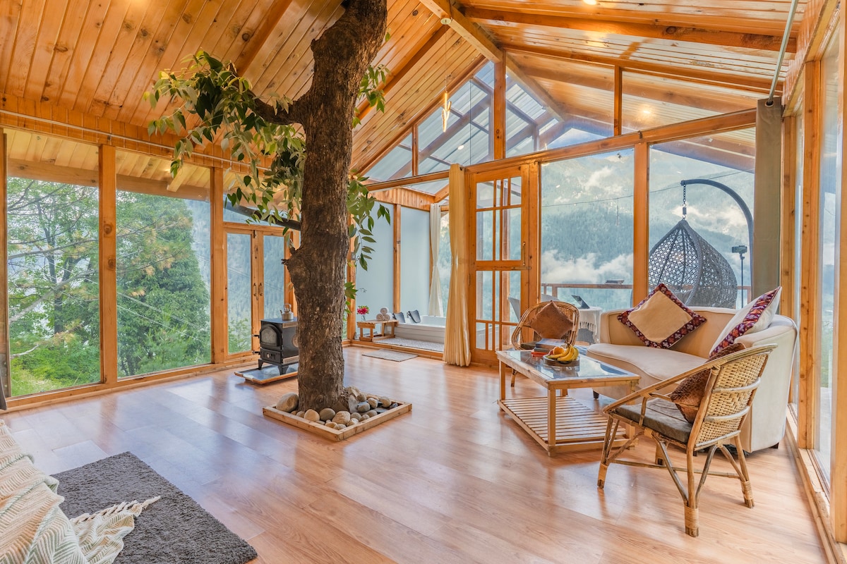 Kućica na drvetu u obliku slova A Sukoon Smeštena usred spokojnih planina u blizini Džibija, kuća na drvetu Sukoon A-Frame nudi miran odmor okružena borovom šumom i pogledom koji oduzima dah. Uređen udobnim enterijerom, velikim staklenim prozorima i daškom rustikalnog šarma, savršen je za parove ili putnike koji traže mir i prirodu. Probudite se u maglovita jutra, uživajte u kafi na balkonu i doživite pravi „sukoon” – mir na Himalajima. 🌲✨ ⸻