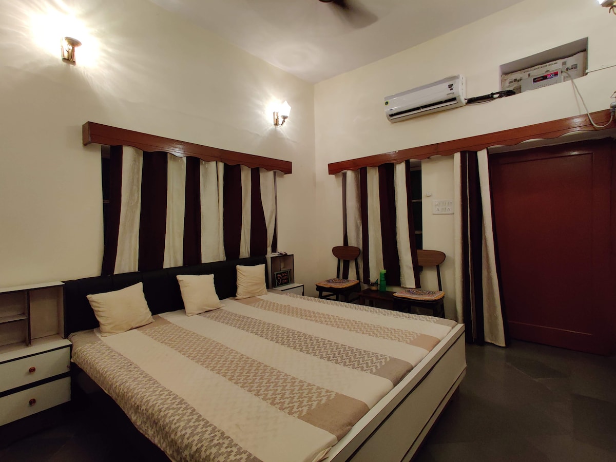 This spacious 3BHK Airbnb offers a perfect blend of modern comfort and style. The expansive living hall is ideal for relaxation while the sleek dining area ensures enjoyable meals. The kitchen makes cooking a breeze. The cozy garden provides a peaceful outdoor retreat. Unwind on the verandah or enjoy Netflix on the 65-inch LED TV. With ample space & thoughtful amenities, this contemporary home is perfect for families or groups seeking a stylish, convenient stay with a touch of luxury & comfort.