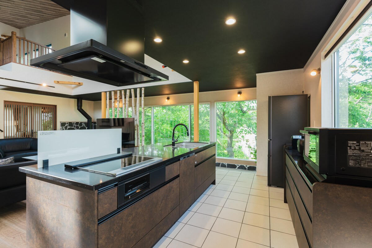 Ovo je nova seoska kuća sagrađena 2022. Ulazeći u elegantnu kuću sa crnim spoljašnjim zidovima, kameni hodnik koji vodi do dnevnog boravka na visokom plafonu učiniće da zaboravite na svakodnevni život. Kupatilo na otvorenom je okruženo drvećem, a zimi možete uživati u opuštajućem kupatilu sa pogledom na sneg. Uživajte u privatnom pozorištu u dnevnoj sobi i spavaćoj sobi sa projektorom od 100 inča. Prikazi i stolovi su takođe na raspolaganju za vaš radni prostor.