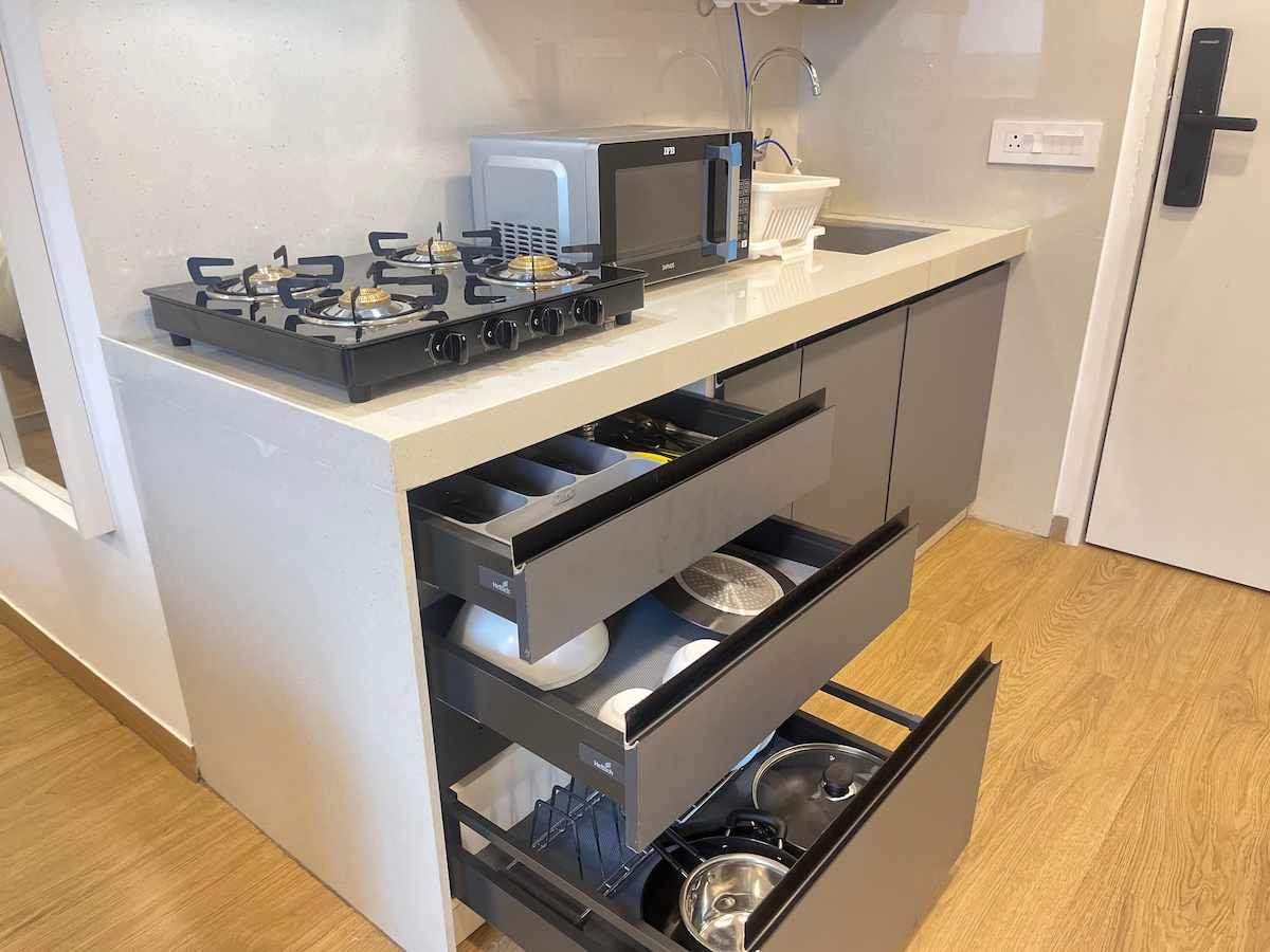 This rustic-modern 2BHK offers soft Giza cotton linen bedding, fast WiFi, a big smart TV, and a fully equipped kitchen with quality silverware. Fresh towels, a dental kit, shampoo, and other essentials are provided for a smooth stay. The entrance has a smart lock entry that makes check-in simple without anyone's intervention or locks and keys. The home is peaceful, well-maintained, and ideal for both work and relaxation. House Rules: No smoking, alcohol, parties, or pets.