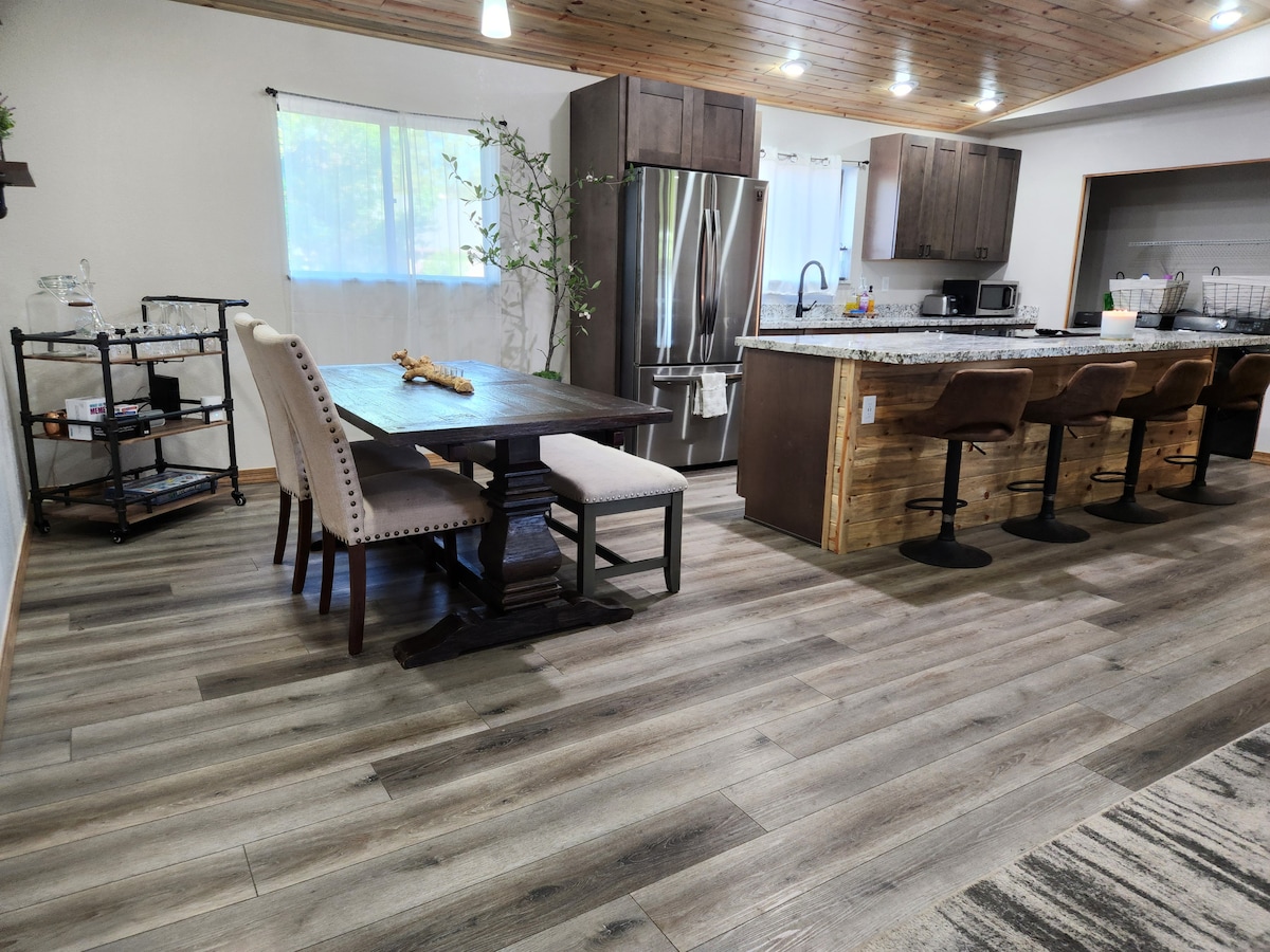 Opustite se u ovoj boho brvnari 5 minuta od jezera, prepunoj udobnosti, okruženi parcelama drveća sa svih strana! Dve luksuzne spavaće sobe sa bračnim krevetom, svaka sa mirnim radnim prostorom i dušekom od14inča. Treća soba sa igračkama, knjigama i 6 neverovatnih ugrađenih kreveta sa vrhunskim beddysima za ugodan san. Prostrana sjajna soba, sa udobnim kaminom i trpezarijom za više od10 osoba. Dovoljno kuhinje, sa ostrvom i ostavom, uključujući sadržaje doma. Plus garažna igraonica - pong, stoni fudbal i košarkaške igre! Odmorite se i napunite baterije!