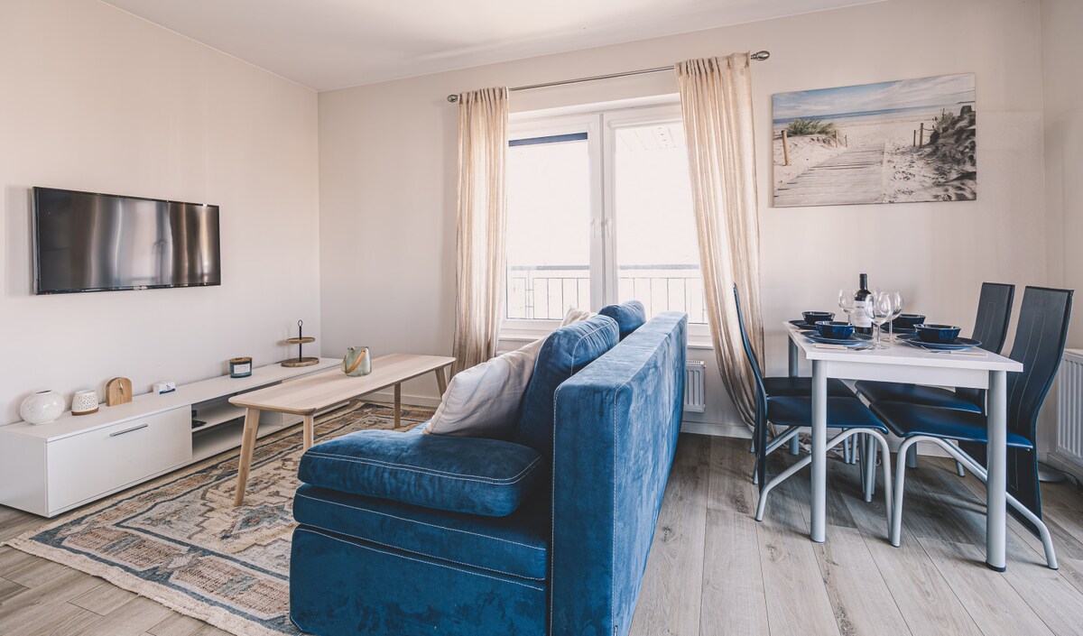 Moderan, prostran stan u novom apartmanu Baltic Marina Residence za 4 osobe. Oko 48 m2 uključuje spavaću sobu koja se može zaključati sa bračnim krevetom dimenzija 140x200 cm, dnevni boravak sa sklopivim uglom, trpezariju, potpuno opremljenu čajnu kuhinju i kupatilo sa tušem. Stan ima izlaz na balkon.