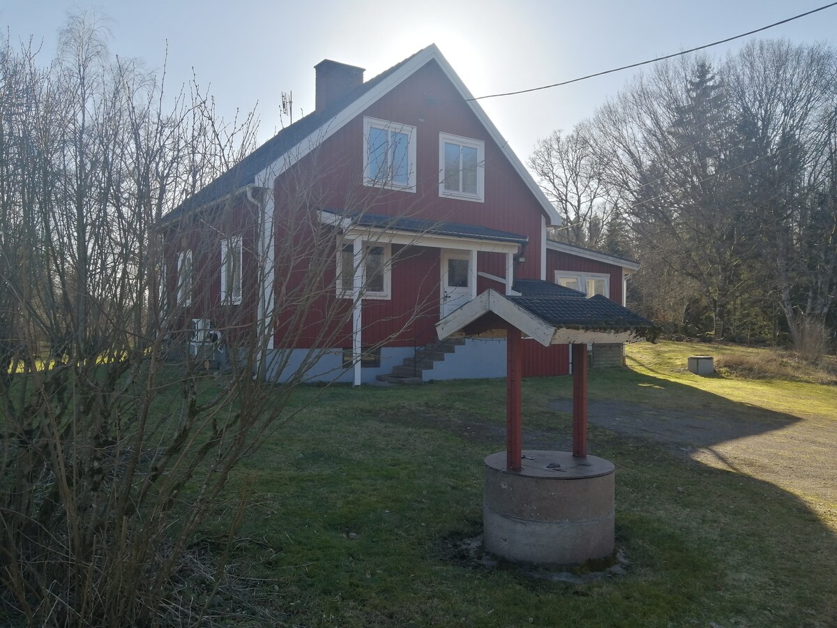This Swedish country side house is a retreat to be in. It is the perfect place to relax close to nature. It has a wooden stove, nice open kitchen, living room and bedroom with glas doors that open to a big terras with private garden. The bedroom has a big double bed and a possibility for a child bed. There is a very comfortable bathroom with bath. Beautiful forests, lakes, playground, bakery (open on fridays), and regenerative veggie farm are just around the corner. PN: Limited public transport