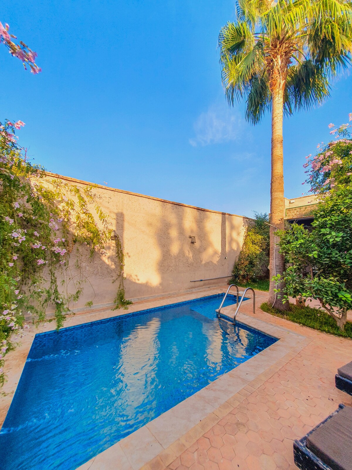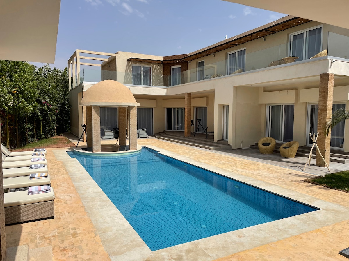 Villa située à +/- 30 minutes de Gueliz et de la médina dans un charmant domaine sécurisé 24/7 avec un terrain de tennis commun et de piscine privées. La villa se compose de 3 tres grandes suites avec chacune leur cheminée, leur télé (Netflix gratuit), 3 salles de bain, d'une petite piscine intérieure chauffée, d'une piscine extérieure privative et d'un jardin privatif sans vis à vis, d'un salon avec cheminée. Table à manger convertible en billard ou en table de ping-pong. Villa au calme.