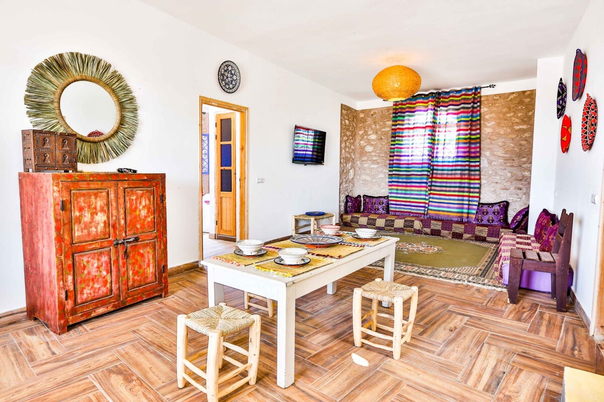 probudite se nekoliko metara od okeana u srcu Sidi Kaoukija. Naš udoban dvosobni stan je idealno mesto za odmor za one koji žele da uživaju u najboljim talasima u Maroku. nedaleko odavde, naći ćete mnogo restorana gdje možete da se okušate u pripremi tažina u potpuno opremljenoj kuhinji. uživajte u miru i autentičnosti našeg malog berberskog sela koje nudi mnoge aktivnosti na otvorenom.