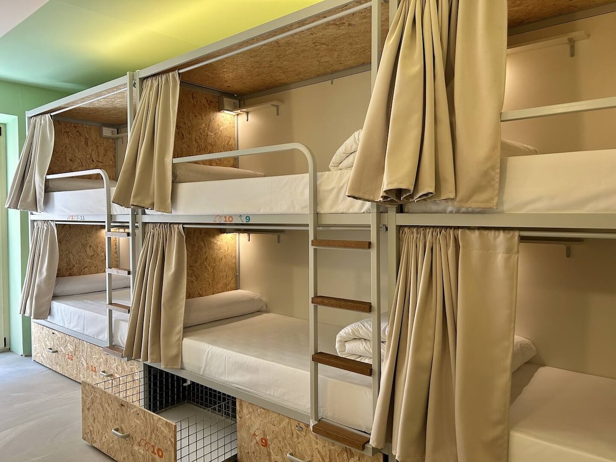 The Loft House Madrid Lavapiés Krevet u ženskoj spavaćoj sobi s prirodnim svjetlom. Literas dužine 2 metra. Svaki krevet ima svoje lično svjetlo, utikač, usb i policu, zavjesu za zamračivanje za dodatnu privatnost i veliku jednu fioku koja se može zatvoriti bravom koja se može iznajmiti na recepciji. Imaju: Klima-uređaj Grijanje Brzi WIFI Zajednička kupatila i tuševi u hodniku Ćebe Posteljina Peškiri (dodatno uz doplatu i na zahtjev)