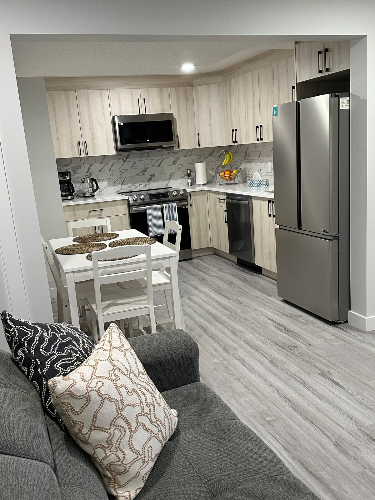 Елегантни апартман са 2 спаваће собе и слободним ходником у подруму је приватно, пажљиво уређено уточиште које нуди префињену удобност и тихи луксуз. Уживајте у топлим вечерима поред камина и обилном природном светлу са великих прозора. Овај пространи апартман са две спаваће собе садржи брачни кревет и један брачни кревет, идеалан за госте који цене приватност, чистоћу и висок стандард удобности.Uključeni su direktan pristup zadnjem dvorištu i namensko parkiralište na prilazu. Nekoliko koraka od staza pored reke Bou, prodavnice Sobeys, organizacije Seton YMCA i bolnice South Health Campus.