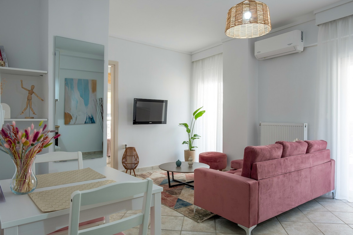 Thea apartman se nalazi u samostojećoj kući u živopisnom Gornjem gradu u Solunu, sa panoramskim pogledom na grad i more i 15 minuta hoda od centra grada. To je prostran, svijetao i udoban stan od 110 m2 renoviran 2020. godine, sa modernom i toplom dekoracijom.