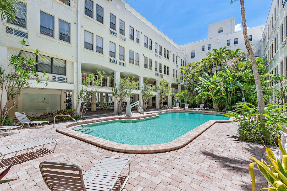 Lokacija, lokacija, stepenice od najboljih restorana, prodavnica u Palm Biču, prodavnice Publiks i nevjerovatne staze uz jezero na kojoj možete da hodate ili vozite bicikl kilometrima. Kratka udaljenost do Breakersa. Plaža je udaljena jedan i po blok. Kada budete spremni da se vratite od dana uživanja u Palm Biču, čeka vas privatna terasa. Zasebna spavaća soba s BRAČNIM krevetom, dnevna soba. Stanje metvice, ukusan novi namještaj, polupuna kuhinja, televizori, klima-uređaj, Wi-Fi, bazen, praonica veša.