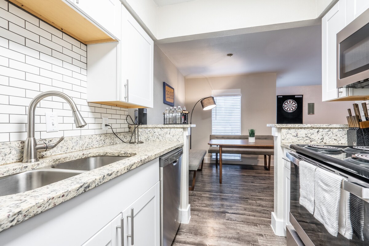 Ovaj moderan i novi stan je savršena baza za istraživanje svega što Arlington ima da ponudi. Bez obzira na to da li ste ovdje poslovno ili zbog zadovoljstva, naći ćete se na praktičnoj lokaciji u blizini glavnih atrakcija kao što su AT&T stadion, Globe Life Field i Six Flags Over Texas. Uz udobne krevete, brzi Wi-Fi i potpuno opremljenu kuhinju, imaćete sve što vam je potrebno za produktivno poslovno putovanje ili opuštajući odmor. Rezervišite sada i doživite najbolje od Arlingtona. *Zatražite iznajmljivanje automobila.