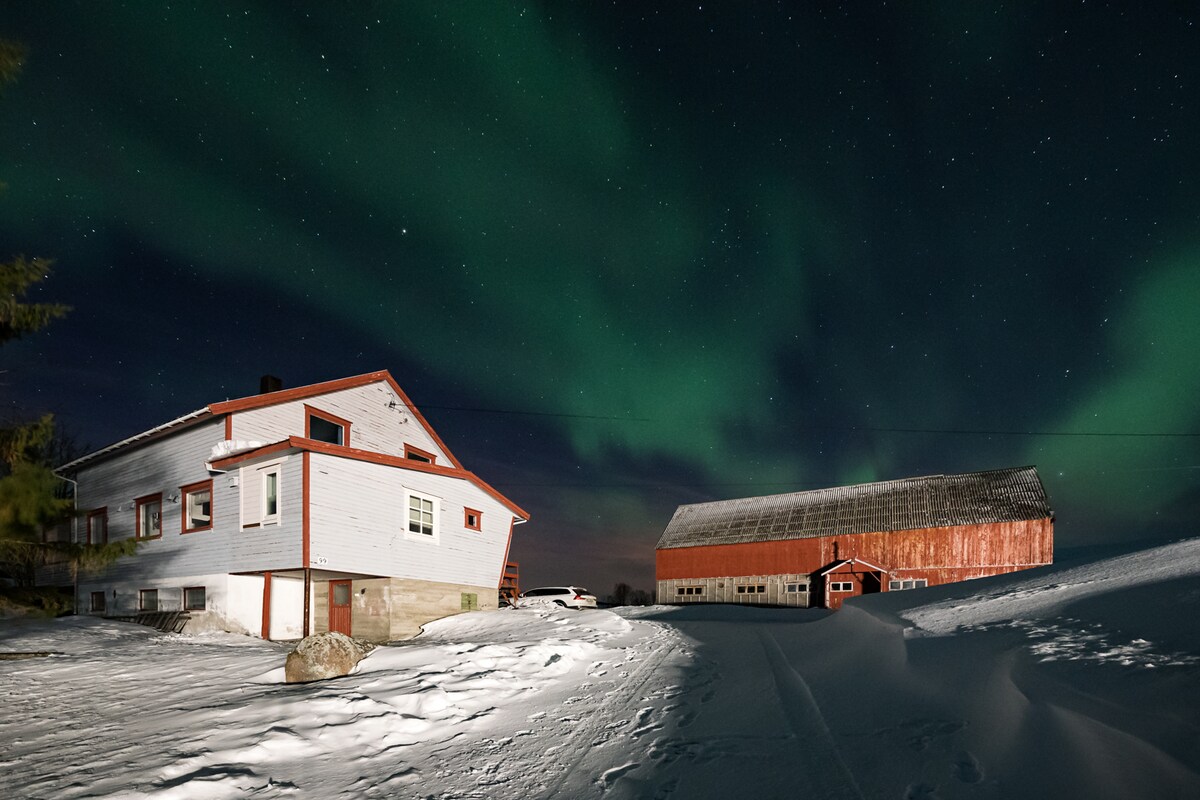 Privatni stan sa velikim balkonom, 50 m od obale. Lokacija nudi velike mogućnosti za polarnu svetlost i prelepe zalaske sunca. Tu je potpuno opremljena kuhinja, 3 kreveta za jednu osobu, 1 kauč na razvlačenje i besplatan Wi-Fi. Možete da naručite našu saunu blizu fjorda za uživanje. Pješačenje ili skijanje u planinama i ribolov u fjordu. Nudimo jahanje kada imamo mogućnost – pitajte Borda Može se naručiti prevoz sa aerodroma Tromso (50 minuta vožnje).