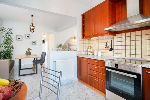 Luksuzni stan u centru Kavale. Nalazi se u Omonoiasu koja je ulica za kupovinu. Samo nekoliko minuta hoda od centra grada i mora. Bezbedan i tih komšiluk. Postoje dve velike prodavnice na 50 m od stana gde možete kupiti svežu hranu i osnovnu opremu. Možete besplatno da parkirate svoj auto na ulici ispred stana.