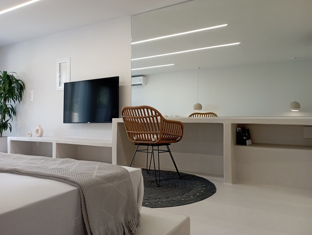 Ovaj samouslužni studio u Tinosu nalazi se u prelepom ribarskom selu(Panormos), na severu ostrva, koje ima slikovitu prirodnu luku i restorane pored mora. Pokriven je belim mermernim podom i ima udobnu sobu sa bračnim krevetom, potpuno opremljenu čajnu kuhinju i tuš-kabinu.