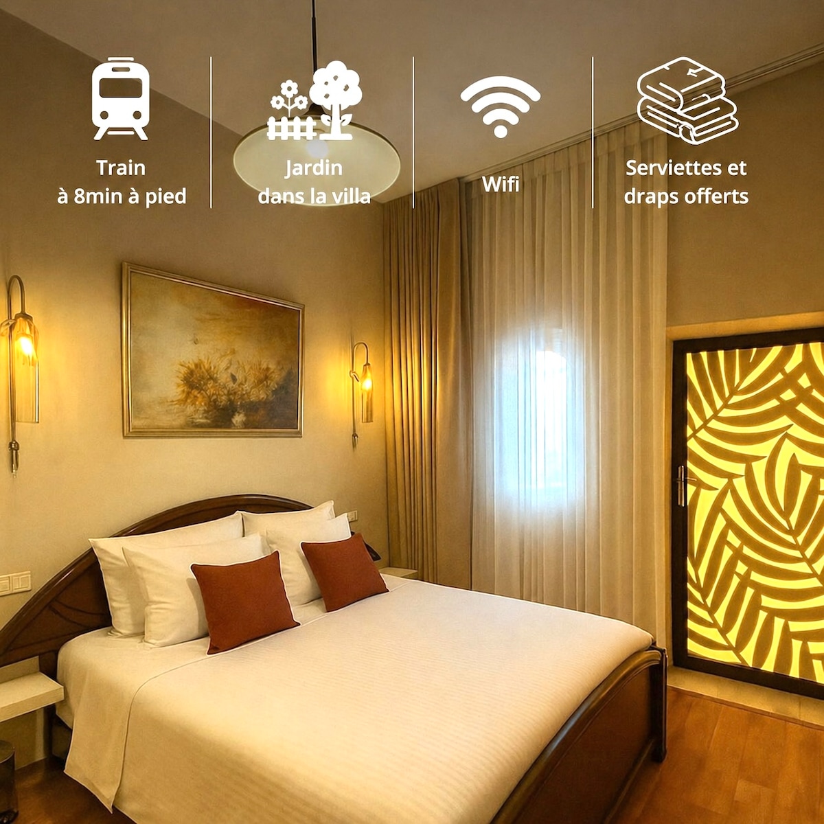 Probudite se uz pogled koji oduzima dah na legendarni toranj Hasan, direktno sa vašeg prozora. Zašto će vam se svidjeti ova vila: • 4 prostrane spavaće sobe, idealne za porodice ili grupe – svako uživa u svom privatnom prostoru. • Svijetao i gostoljubiv dnevni boravak, savršen za zajedničke obroke, opuštanje ili planiranje dana. • Privatno dvorište, idealno za jutarnju kafu, čitanje ili opuštanje u večernjim satima. Nevjerovatna lokacija: Izađite napolje i prošetajte do glavnih znamenitosti Rabata, živopisnih kafića, restorana…