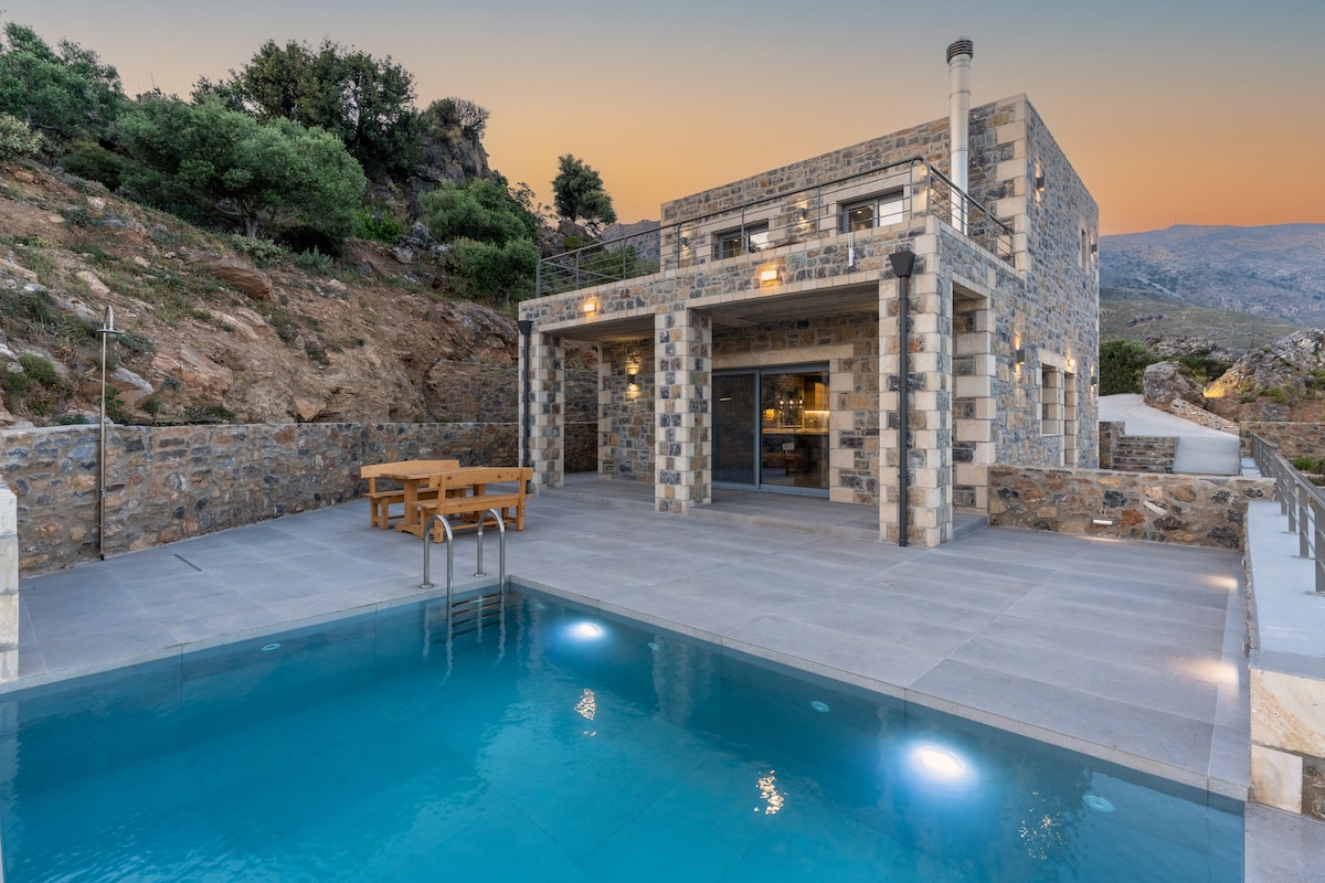 Pogled na more u vili na Južnom Kritu sa grijanim bazenom i roštiljem