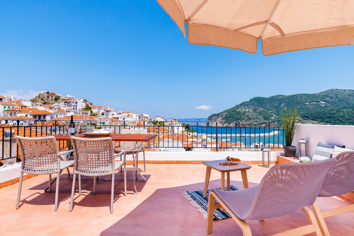 VilaAvaton sa veličanstvenim pogledom na more i grad Skopelos