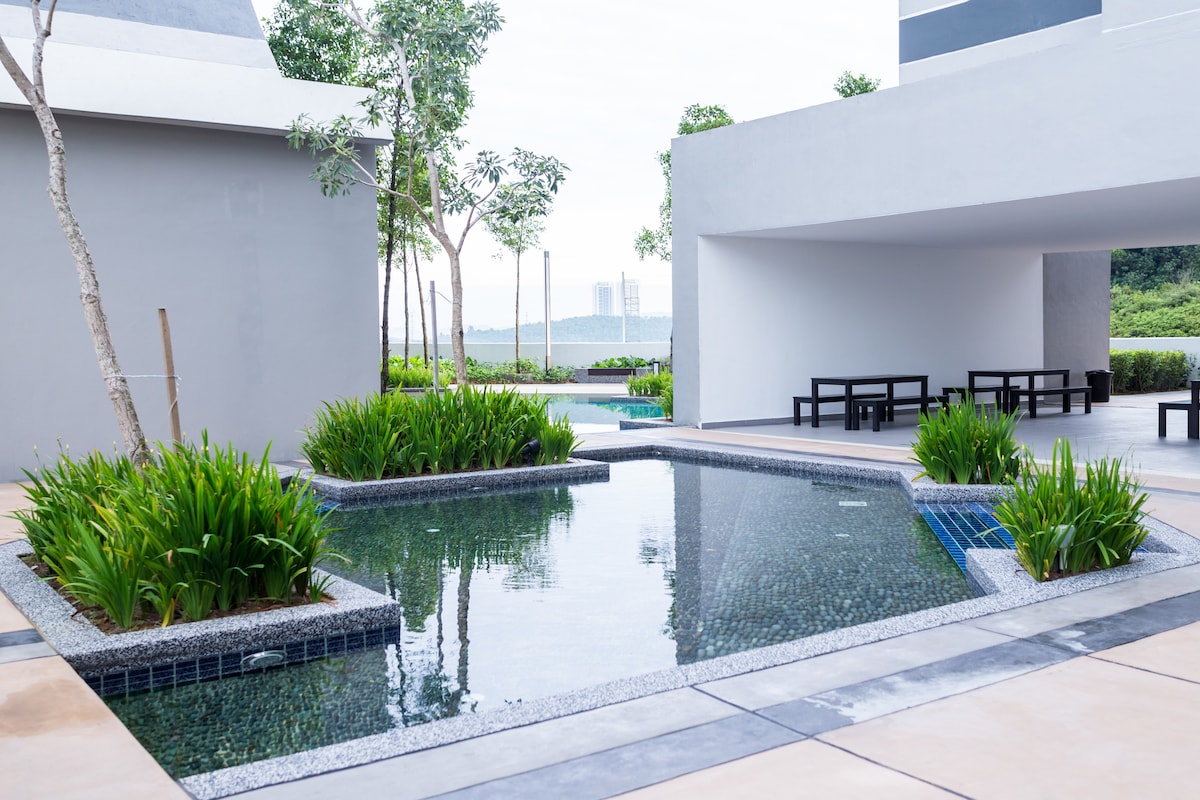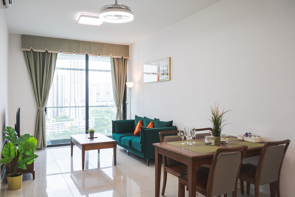 🤗JB House je elegantno utočište na visokom spratu sa 2 spavaće sobe, hotelskim detaljima, mekom posteljinom, uređenim dekorom i punom kuhinjom. Savršeno za porodice, parove, prijatelje i poslovne putnike, sa pristupom bazenu, teretani, sobi za igre i besplatnom parkingu. Nalazimo se na nekoliko minuta od Legolenda, Bukit Indaha, Sunway Big Box-a, Medinija i glavnih autoputeva. Zabava, hrana, kupovina i miran odmor, sve je zgodno blizu. Očekujte čist, gostoljubiv prostor, odlične sadržaje, pažljivo osmišljen boravak, pravi dom daleko od doma sa 5🌟