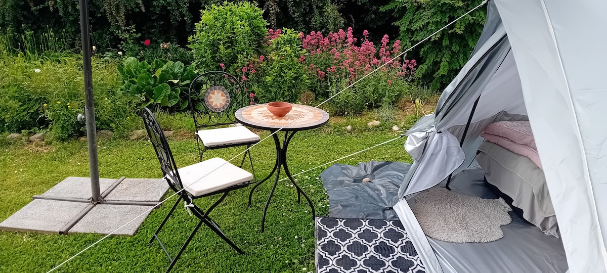Šator za glampovanje nalazi se na malom brdu pored naše apartmanske kuće i nudi prekrasan pogled na Bledski dvorac i planine. Iza brda, gdje se nalazi šator nalazi se mala šuma i glavni put sa pješačkom i biciklističkom stazom do supermarketa (200 m) i kanjona Vintgar (3,5 km). Pored šatora nalazi se pergola sa otvorenom kuhinjom i trpezarijom. Privatno kupatilo se nalazi niz stepenice u kući i udaljeno je 40 metara od šatora. Naš smeštaj nudi besplatan parking.