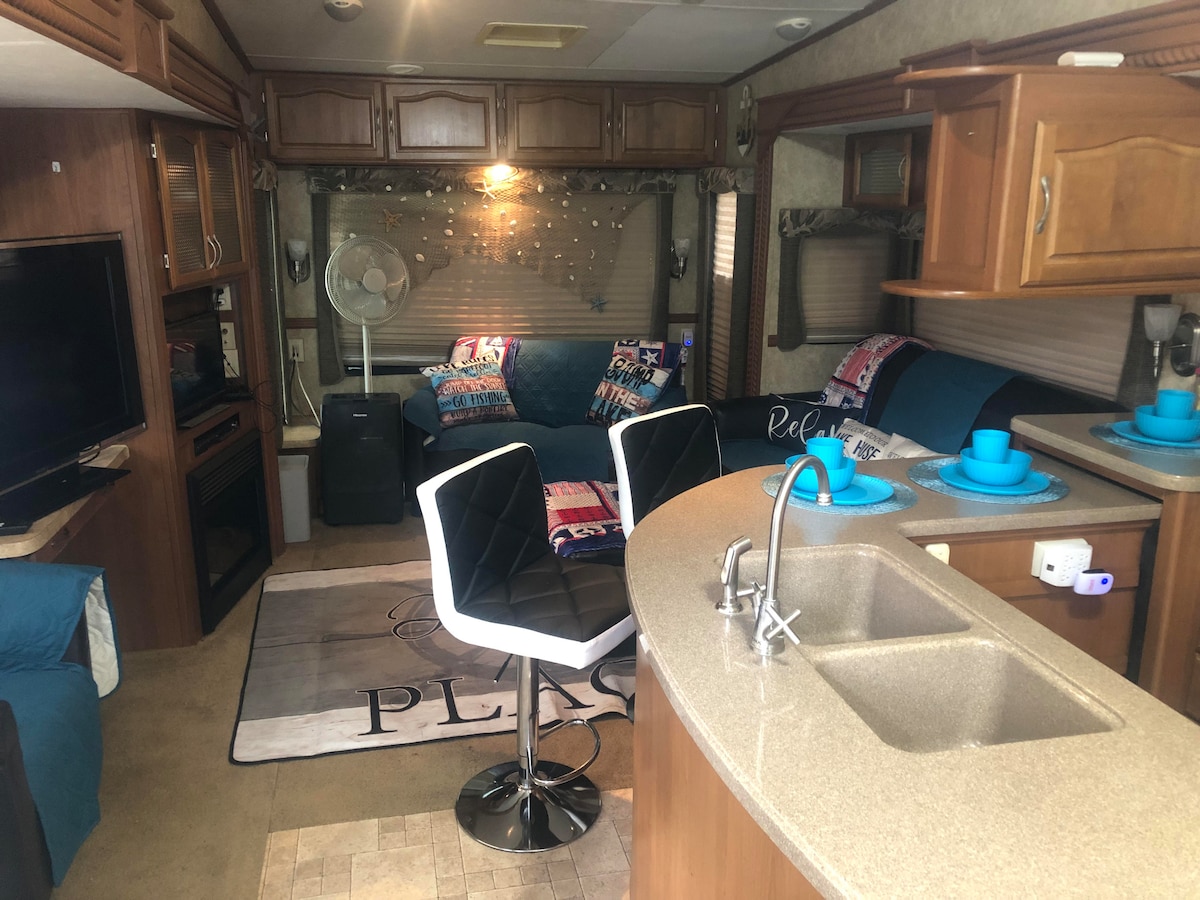Prelijepa kamp prikolica prikladna za kućne ljubimce iz 2018. godine sa 1 bračnim krevetom u spavaćoj sobi i 1 kupatilom. Potpuno priključen na struju, vodu i septičku jamu. Kreveti na sprat pune veličine u zadnjem dijelu kampera. Ima potpuno opremljenu kuhinju sa plinskim šporetom, mikrotalasnom rernom i frižiderom. Ovaj kamper se nalazi u privatnom okruženju na mom imanju od 5 hektara sa parking mjestom ispred kampera. Vrlo miran komšiluk sa 3 kuće. Komunalne usluge su uključene (struja, voda, smeće i Wi-Fi). Prva 2 rezervoara propana su obezbijeđena za dugoročne boravke. Prikladno za kućne ljubimce i LGBTQIA+.