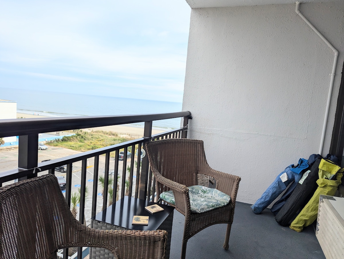 TRUE 1 bd 1 ba 9th flr END UNIT oceanview sunrise condo is everything you 're looking! Prostrani majstor nudi 1 bračni krevet (širine 180-179 cm) Novi kauč za spavanje i trpezarijski sto u dnevnom boravku. Nova tuš kabina. Mašina za pranje/sušenje veša U JEDINICI! Dnevni boravak s klizačem koji vodi do balkona s pogledom na okean. Potpuno opremljena kuhinja s novim aparatima. Priključena, ograđena parking garaža. NOVI HVAC za udobnost! Pogodno se nalazi u blizini pristaništa Springmaid, državnog parka, Market Common, aerodroma. Unutrašnji/spoljašnji bazeni, lijena rijeka, hidromasažna kada, teretana, terasa uz okean.