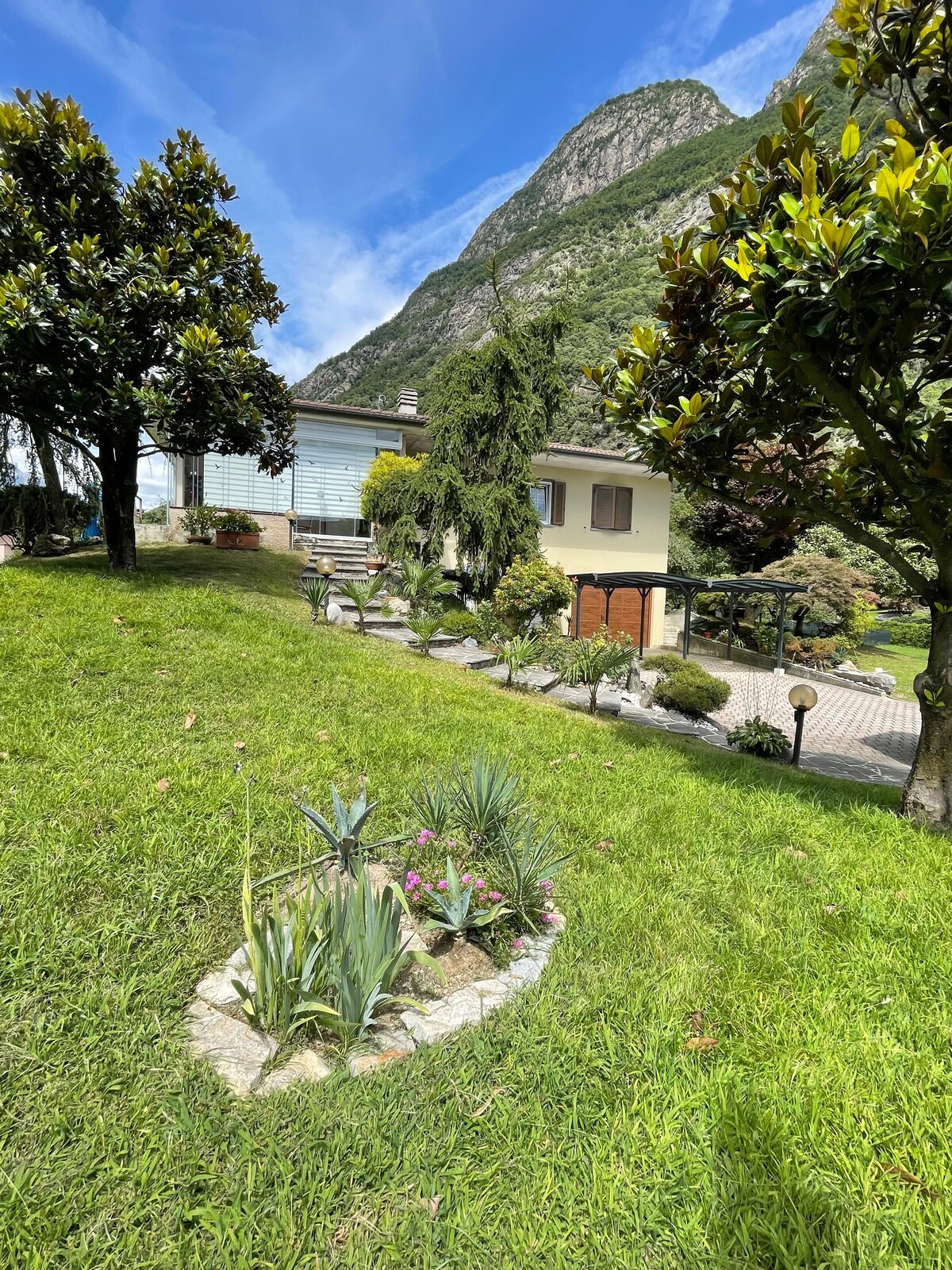 Dvosobni stan od 60 kvadratnih metara u prizemlju u samostojećoj kući, bez stepenica. Samostalna prijava i privatna bašta, možete koristiti ležaljke. Pristup sa automobilom i natkrivenim privatnim parkingom ispred ulaza, satelitskom televizijom, Wi-Fi mrežom, kompletnom kuhinjom, šporetom, kuvalom, frižiderom, rernom, mašinom za pranje sudova,tosterom. Spoljašnji prostor sa stolicama, stočićem, suncobranom. Korišćenje mašine za pranje veša 5 EUR. Skijaške staze: Madesimo 40 minuta, Sent Moric 60 minuta Jezero Komo, 15 minuta Chiavenna 5 minuta Nacionalni identifikacioni broj: IT014057C2MGOQV84W