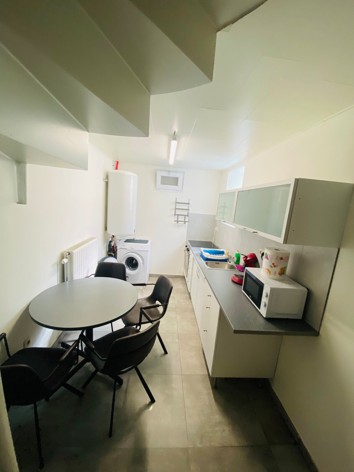 Imate veliku sobu okrenutu ka bašti, sa velikim bračnim krevetom, dnevnim boravkom sa sofom na razvlačenje, malom kuhinjom. Ulazni hodnik vas vodi do tuš kabine. Pogled na baštu je prelijep (pristup terasi). Jedna soba vam nije dostupna, mala kancelarija koju koristim za svoj posao ( ja sam psiholog). Možda imam pacijente, ali smo vrlo diskretni i nikada ne radimo vikendom ili kasno uveče.