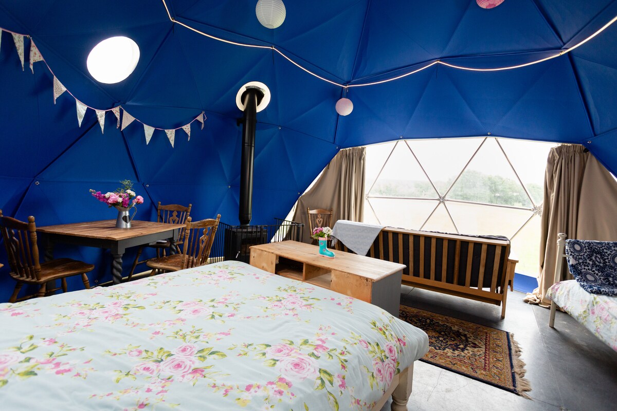 Deere dome is situated in 6 acres of meadow and we've made glamping with the family as easy as possible! The dome sleeps 5 in 2 double beds and a single bed and has an outdoor kitchen attached with a private flushing toilet. There is a full communal kitchen and private shower room a short walk away, with a games room and soft play. We have 2 outdoor play areas for the children plus a treasure hunt and woodland sculpture trail. Bedding is included, you just need to bring your own towels.