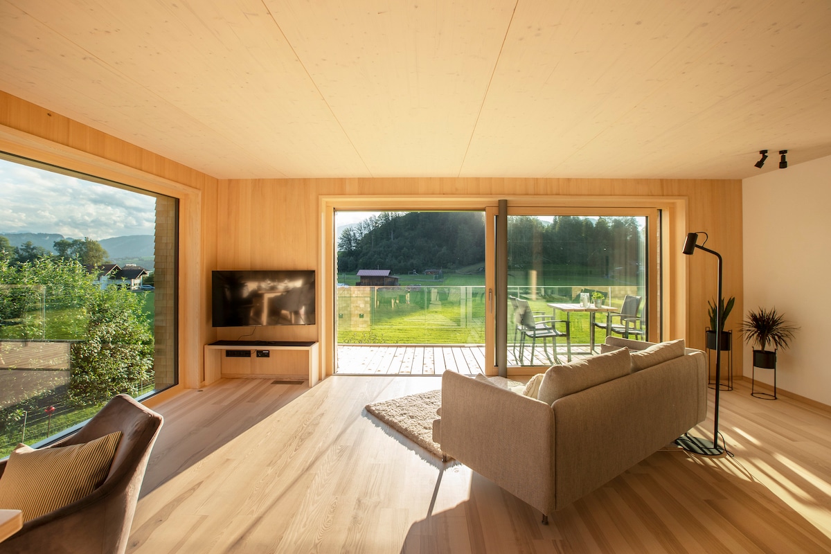 Samo 10 minuta od Bregenca i jezera, nudimo prostran stan, sa terasom za opuštanje i pogled na Bregenzervald. Možete i da uživate u lokaciji bez automobila. Autobus vozi svakih pola sata ispred kuće do centra. Stan nudi dvije spavaće sobe, pomoćni krevet za bebe, potpuno opremljenu kuhinju s visokokvalitetnim uređajima, uključujući mašinu za pranje sudova i potpuno automatski aparat za kafu. Planinarske i biciklističke staze nalaze se u neposrednoj blizini kuće.