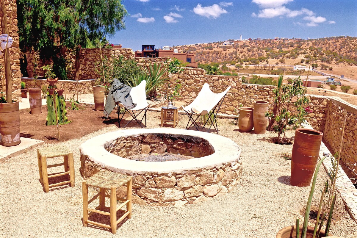 Ce riad ancestral est ouvert sur la vie locale. Les racines de ses hôtes berbères sont ici, dans le village d'AÏT BIHI.. situé à 3kms de Taghazout, en milieu rural. Son caractère historique séduira les voyageurs responsables, soucieux de vivre l'authenticité marocaine, non les vacanciers attirés par une location aux standards occidentaux. Ce Dar avec vue sur mer héberge 10 voyageurs. Cuisine solidaire réalisée par les femmes du village. Location de planches de surf. Retraites Yoga.