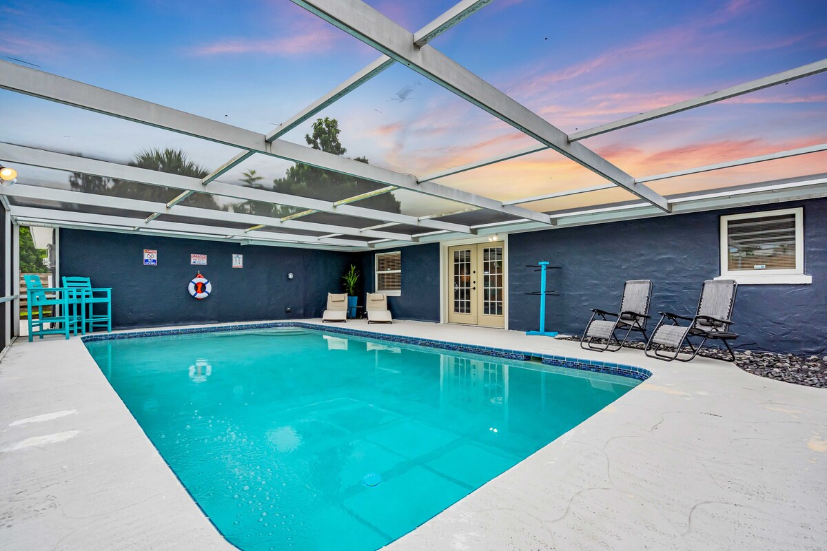 🌴 Heated Pool • Spa • Tiki Hut • 10 Min to Siesta Key Private pool oasis just minutes from Siesta Key — designed for relaxing days and unforgettable nights. Enjoy a heated pool (heated at NO extra cost from Nov 21st - Apr. 1st), spa with waterfall, tiki hut lounge, and a fully screened lanai for indoor-outdoor living. Relax poolside, play outdoor games, and unwind under ambient evening lighting. Perfect for families, couples, and groups seeking a memorable Florida getaway.