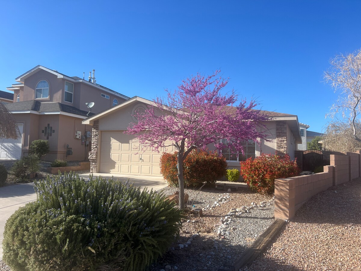 Nevjerovatan dom u zapadnom stilu dovoljno velik za celu porodicu koja se nalazi između Santa Feja i Albukerkija. •Dve spavaće sobe, jedno kupatilo. •bračni krevet, bračni krevet, bračni krevet i jedan bračni krevet sa krevetom. •Velika dnevna soba i kuhinja za porodično vreme. •Terasa za opuštanje uveče ili uživanje u kafi i posmatranju balona ujutru. •Deset minuta od parka Balloon fešta • Pristup parkingu u garaži za dva automobila ili prednjem dvorištu. • Savršena lokacija za istraživanje prelepih planina NM.