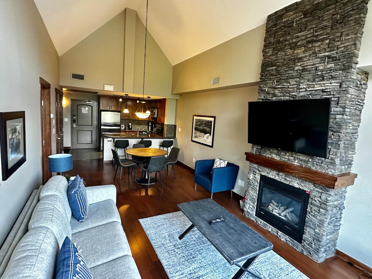 Ova ugaona jedinica na gornjem spratu u Timberlineu je potpuno renovirana. Ima prostranu glavnu spavaću sobu sa tuš kabinom u privatnom kupatilu, HD Smart TV, kamin i veliki sekcijski kauč na kojem se možete opustiti nakon dugog dana provedenog na padinama. Imate i pristup višestrukim hidromasažnim kadama i saunama Timberline Lodges. Ovo mesto je zaista parče raja!