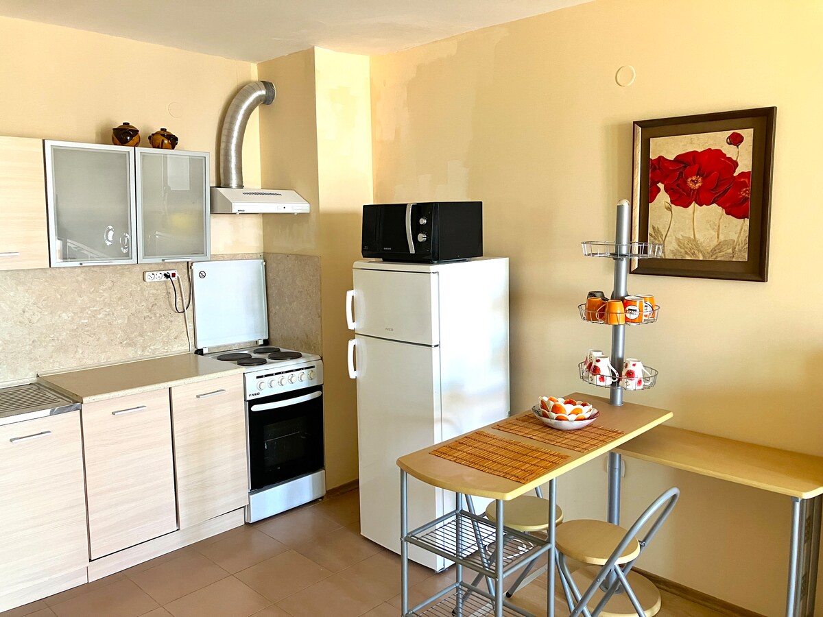 Prostran jednosoban stan u ograđenom kompleksu sa modernom spavaćom sobom, velikom dnevnom boravkom, potpuno opremljenom kuhinjom, kupatilom sa WC školjkom i prelepim pogledom na bašte i park Sozopol. Uključuje klima-uređaj, TV, Wi-Fi i besplatan parking i pristup privatnom bazenu. Smješten samo 5 minuta hoda od plaže Zlatna Ribka, vaš udoban odmor je zagarantovan ovdje. Radite od kuće? Rado ćemo vam obezbijediti radni sto i stolicu na zahtjev.