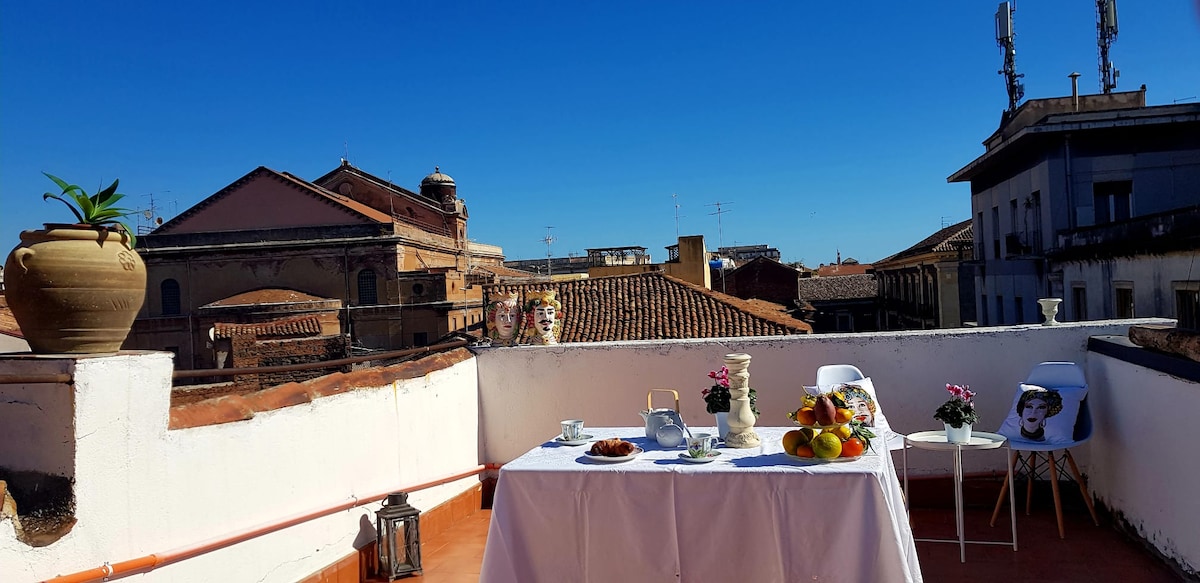 Casa Minè is a large and bright apartment in the historic centre of Catania, at a few steps from the Medieval Castle and Museum Castello Ursino. Recently renovated and furnished with attention to detail, Casa Minè has a private terrace with breathtaking view from the sea, the baroque domes of Catania to Mt Etna. As a guest, you are going to enjoy two huge double bedrooms, a comfortable living room with open kitchen, a modern bathroom, baby room and exclusive access to the rooftop terrrace.