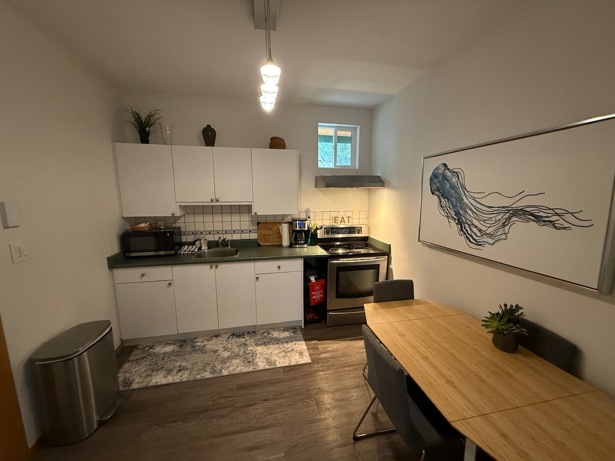Privatni odmor koji se nalazi na površini okružen šumom sa pogledom na planinu Kari. Apartman je okrenut ka jugu na donjem spratu kuće sa privatnim prilazom + ulazom. Dekor je rustikalan, ali moderan, sa mnogo prirodnog svetla, tako da je ljeti hladan i prozračan, udoban uz vatru zimi. Zabava uključuje pozorište sa 85" 4K TV-om + 7,1 surround, PS5 (1 daljinski), kokice, hokej na balonima, bilijar, igre, saunu + hidromasažnu kadu za 5 osoba. Nalazi se 45 minuta N u Vistleru. IG: @OwlRidgeLodge