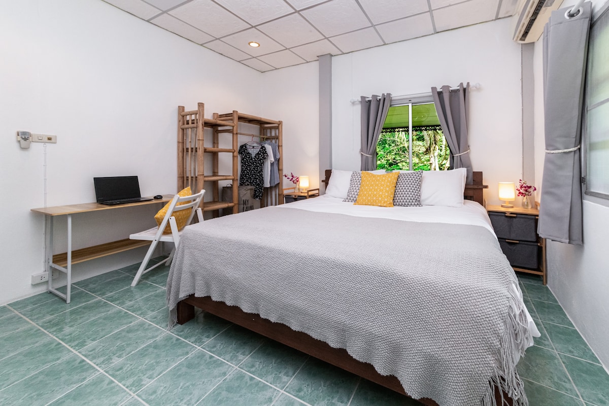 🏝️ DIGITAL NOMAD PARADISE - CENTRAL KOH PHANGAN LOCATION Radite na daljinu u tropskom luksuzu! Ovaj moderni bungalov s 1 spavaćom sobom ima profesionalnu kancelarijsku opremu sa 4K monitorom širokog ekrana i namjenskim radnim prostorom - savršen za digitalne nomade i parove. ✨ Šta ovo čini posebnim: • Profesionalno postavljanje kancelarije sa 4K monitorom • 2 moćne klima-uređaje za tropsku udobnost • Centralna lokacija - jednostavan pristup plažama i sadržajima • Brzi WiFi u cijelom smještaju • Bračni krevet (6 stopa) za vrhunsko opuštanje