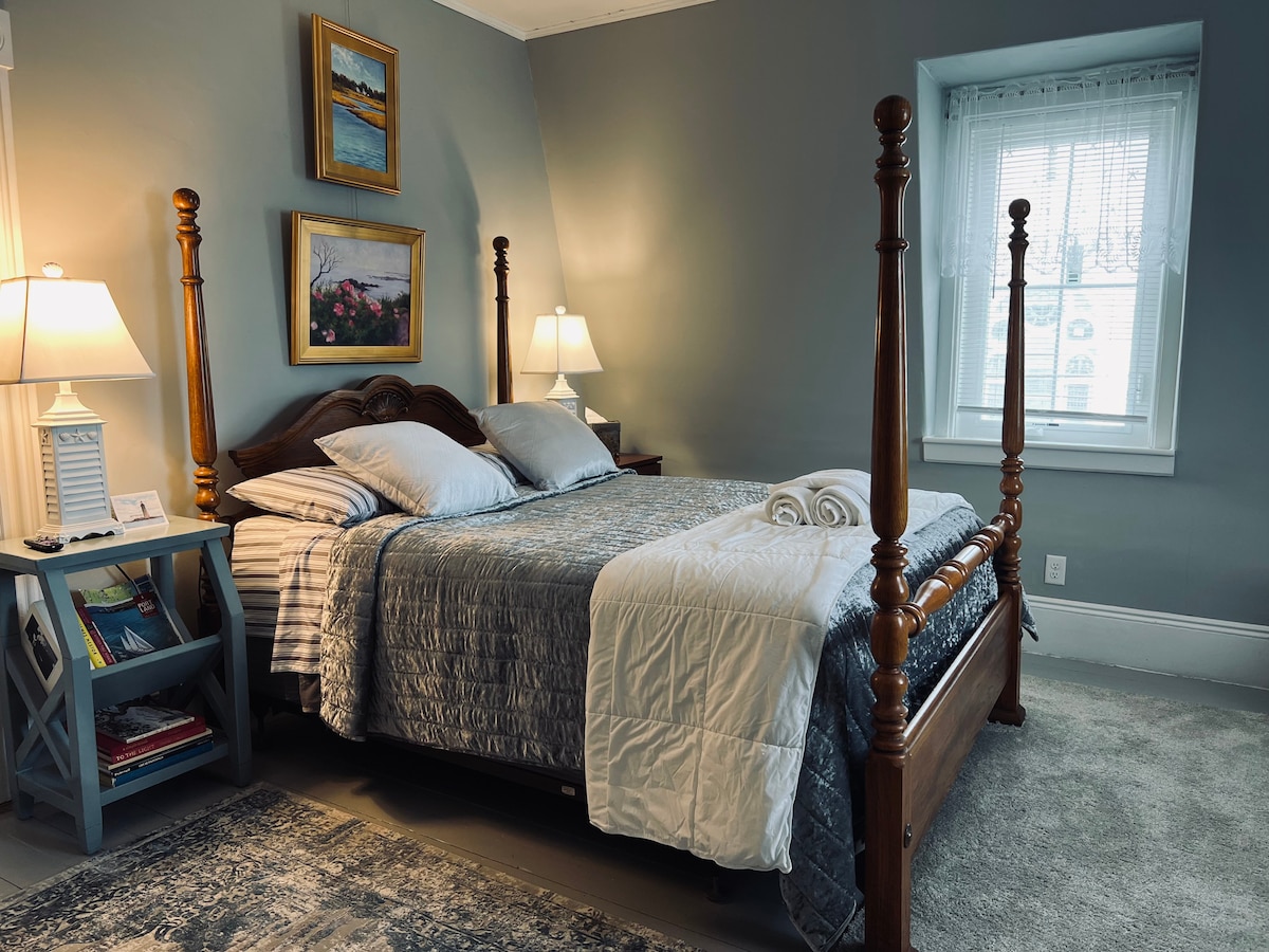 Moj dom se nalazi u malom gradu na prašnjavom putu i veoma je privatan. Obala rt 1/okean je udaljena oko 25 minuta i nudi svjetionike, jastoge i gostoprimstvo u Mejnu. Ova soba za goste ima krevet u punoj veličini koji je složen sa jastucima i antiknim prekrivačem, komodom i ormarom. Kupatilo se može pohvaliti tušem, kao i kadom za noge sa kandžama ako želite da se opustite. Postoji televizor i klima-uređaj u toplijim mesecima, kao i plafonski ventilator kao alternativa.