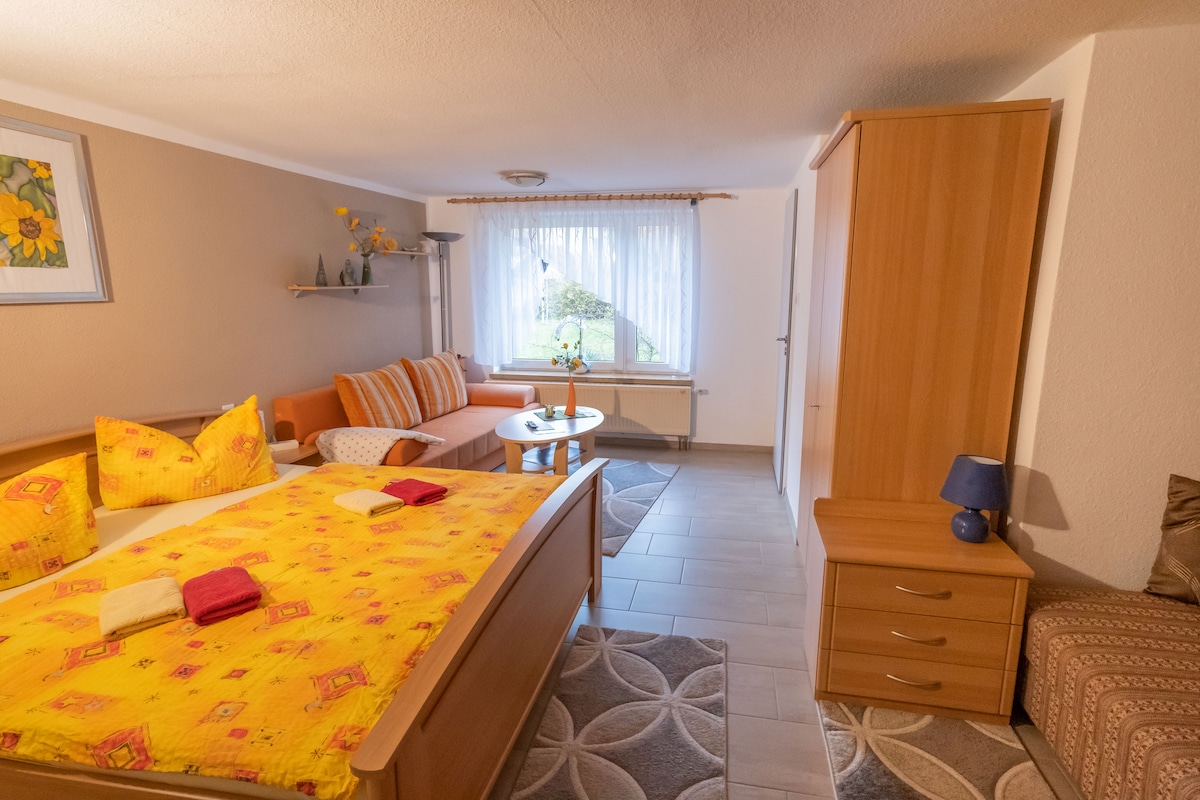 Mirni, udobni stan na prvom spratu naše oglašene kuće od pola drveta u malom selu u planinama Elbe Sandstone. Sastoji se od dnevnog boravka sa zasebnim prostorom za spavanje za 2 osobe i spavaće sobe koja se može rezervisati sa 2 dodatna kreveta, kuhinjom i kupatilom. Poznate kamene formacije i planinarske staze su lako dostupne. Autobuske linije su dostupne u selu.