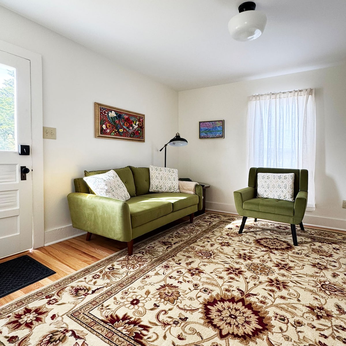 Stay in a charming apartment inside a historic building that now serves as a vibrant art center. This two-story retreat features a welcoming living/dining room and fully equipped kitchen on the main floor, with two bedrooms, a bathroom, and washer/dryer upstairs. One bedroom offers a queen bed, while the other has two twin beds, accommodating up to four guests.