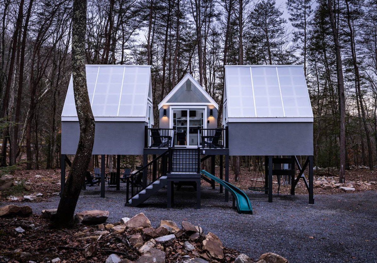 Podseća na osvetljenu plutajuću lampu, naš Glo Haus nudi uzvišeno glampovanje među drvećem. Naš Glo Pod se sastoji od tri mahune: dve kapsule za spavanje i jedne kapsule za okupljanje. Dve kapsule za spavanje udobno spavaju do dve osobe u bračnim krevetima (Twin XL) do bračnih kreveta (King). Uključili smo jedinstvene karakteristike kao što su klizni izlaz za djecu, ljuljačka i projektori Aurora Night Sky za posebnu svjetlosnu predstavu. Ovo će biti zaista jedinstven doživljaj!