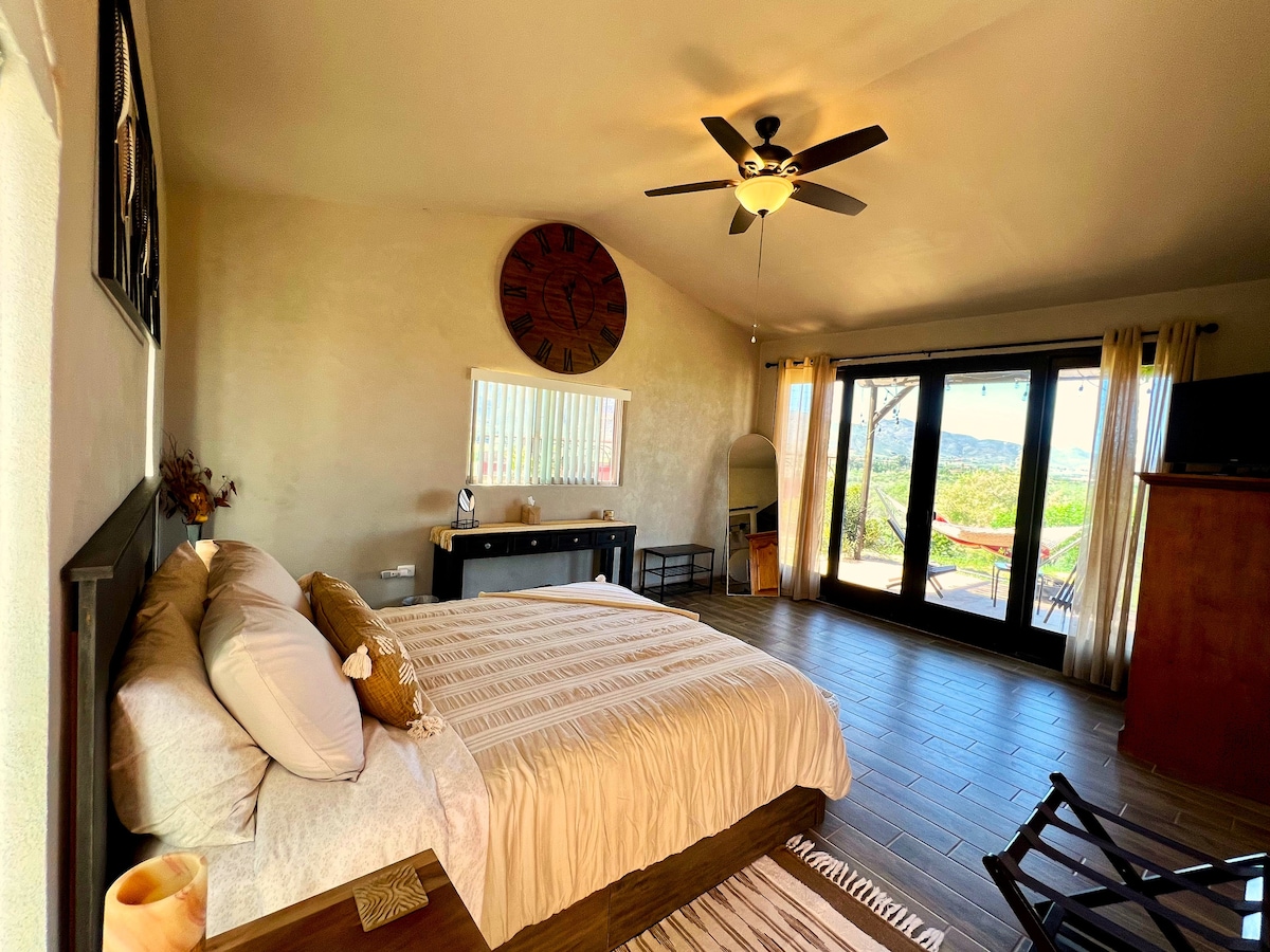Prelijepa brvnara @TerraMonarca nudi neometan pogled na prelepu Valle de Guadalupe. Nalazi se u potpuno ograđenom objektu koji se nalazi u centru grada, gde ćete uživati u potpunoj privatnosti, zajedno sa prelepim sadržajima na otvorenom. Uživajte u danu posete Vena Cava, Concierto Enologico, Salvia Blanca, Once Pueblos, Finca Altozano i još mnogo toga u vinarijama i restoranima u La Ruta del Vino, a zatim se povucite u svoju prelepu sobu i uživajte u svom privatnom dvorištu sa kaminom i punjenjem za još jedan dan zabave u Valleu!