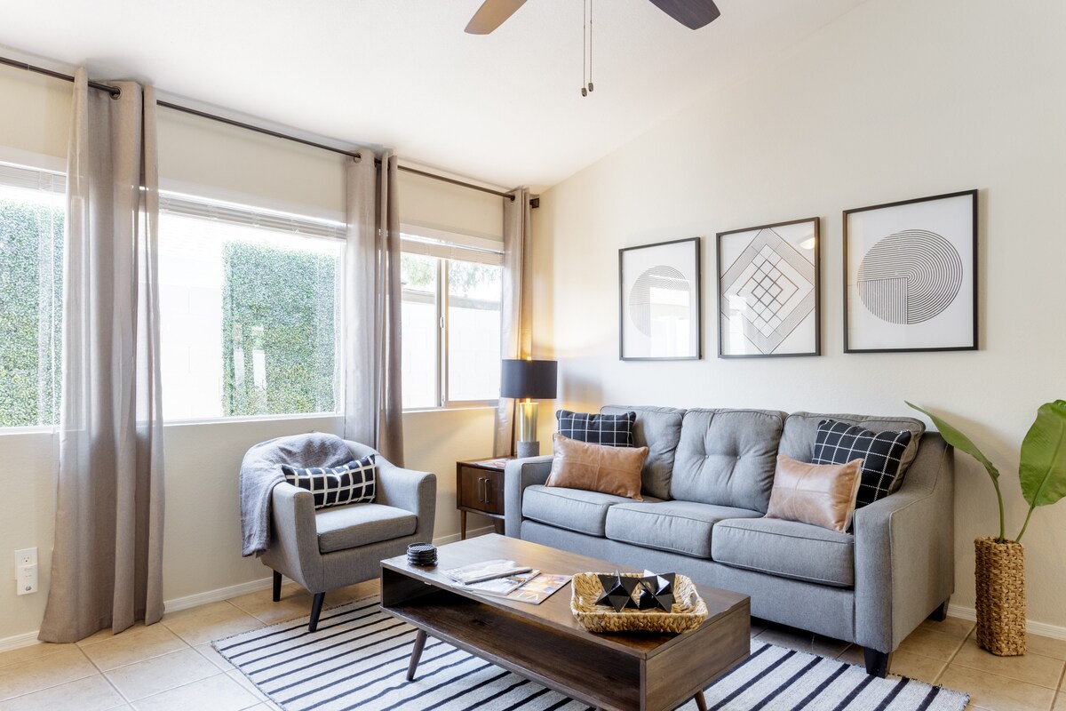 Otkrijte savršeno utočište u Skotsdejlu u ovom elegantnom studiju udaljenom nekoliko minuta od beskrajne zabave. Opustite se u luksuznom bračnom krevetu, uživajte u udobnom prostoru za sedenje sa okretnim stolicama i Roku pametnim TV-om i uživajte u kafi na privatnom dvorištu. Najbolje od svega, imaćete besplatan pristup vrhunskom bazenu u Skotsdejlu udaljenom 1,6 km. Pešačenje do restorana, kupovina, Topgolf, skakanje sa padobranom u zatvorenom, prolećni bejzbol trening i još mnogo toga. Idealno za parove ili putnike koji putuju sami. TPT #21484025 SLN #2023673